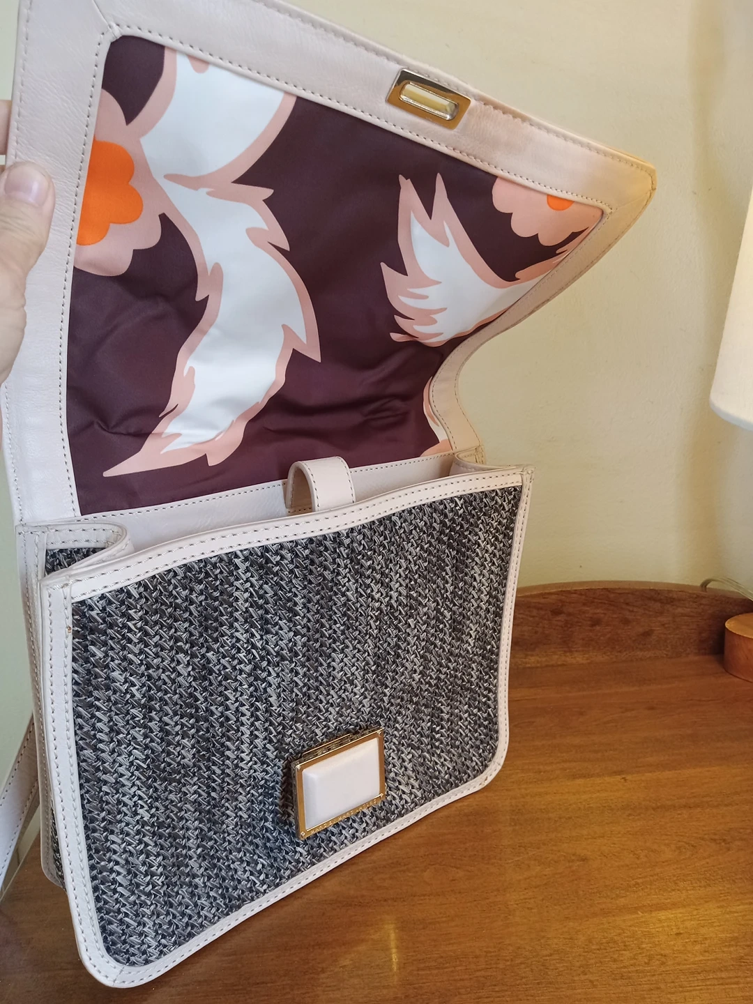A soft blush pink leather with a gray tweed fabric with a bit of a metallic sheen, it's stunning.