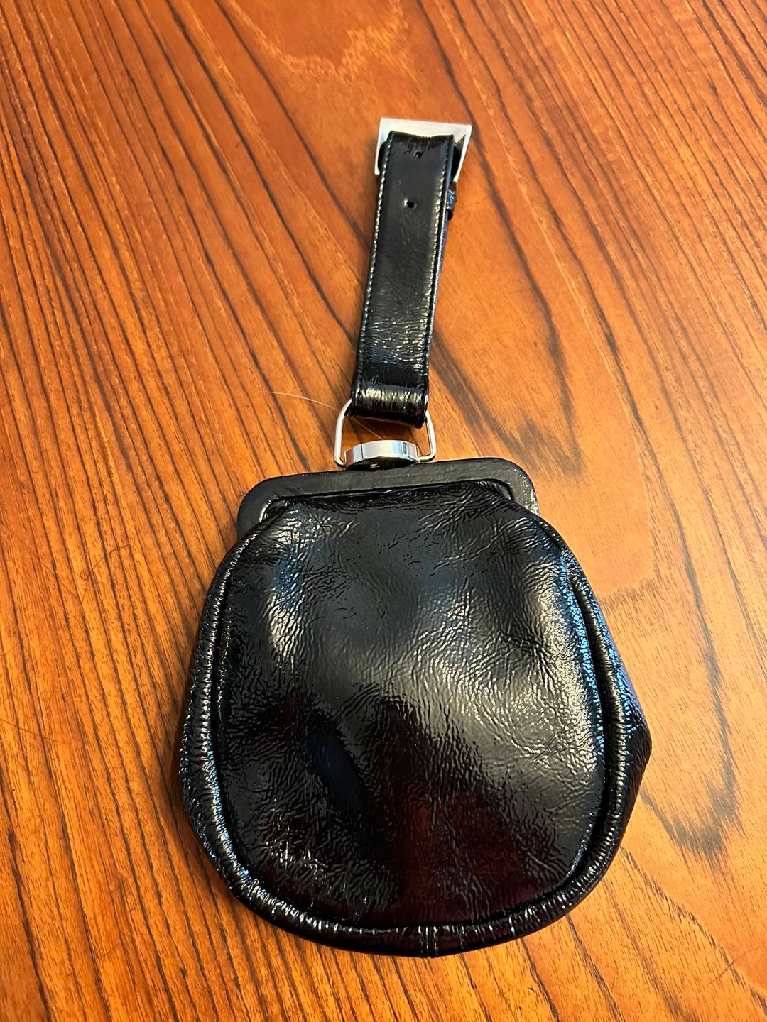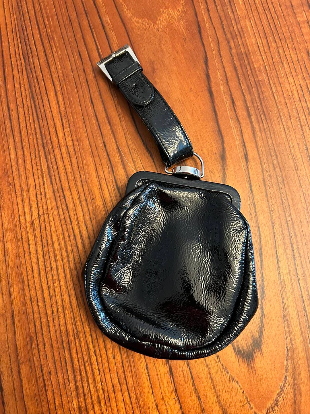 Cute and stylish black patent leather wristlet with adjustable strap and chrome tab closure. Fully lined with small pocket inside.