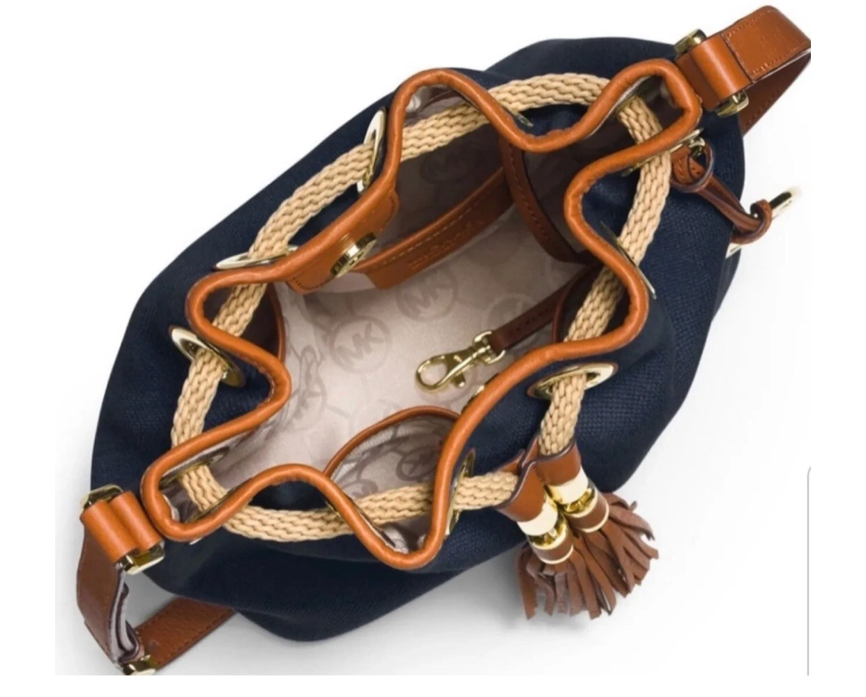 Bold braided rope adds an element of nautical style to a roomy crossbody bag crafted from color-saturated canvas. Leather tassels provide some flirty movement, while the metal Michael Kors logo adds the final touch.