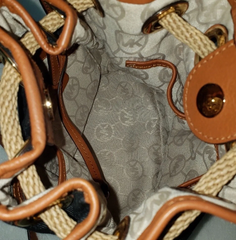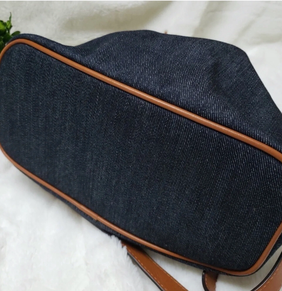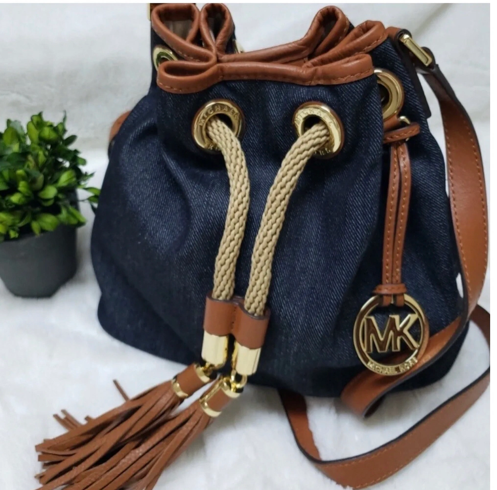 This Michael Kors Marina drawstring tote shoulder bag is perfect for a casual occasion. The exterior of the bag is made of denim material with a navy blue color and accented with a tassel. The bag features a drawstring and magnetic snap closure, with brown leather straps that are adjustable for your convenience.