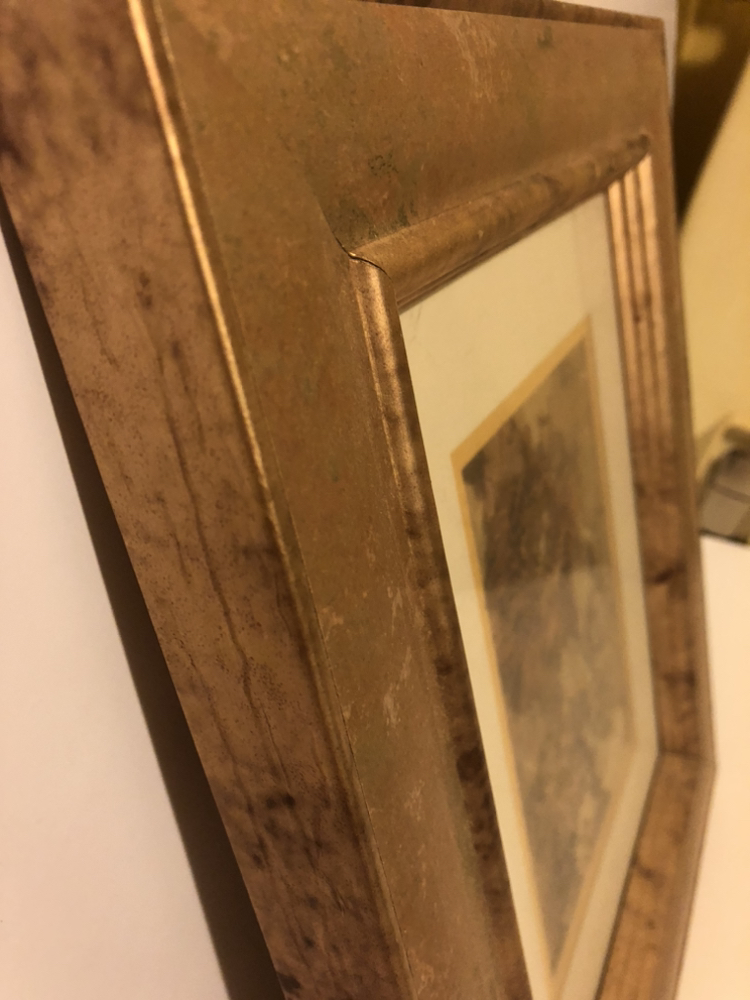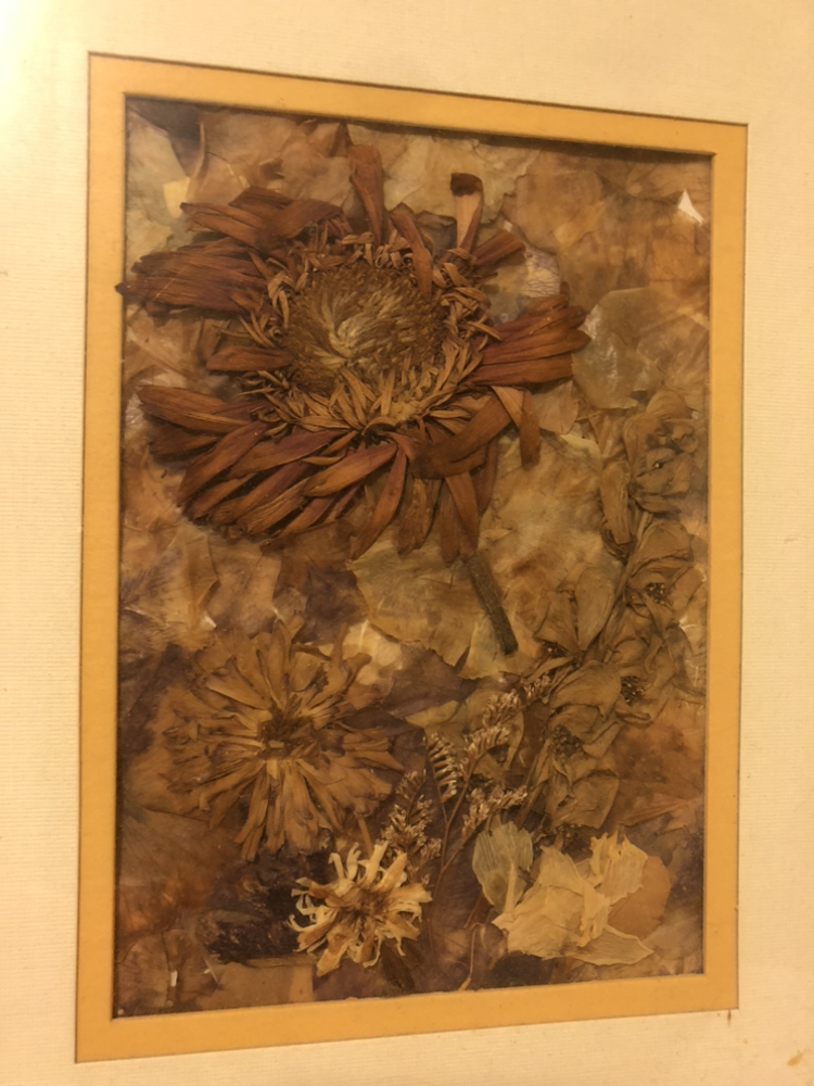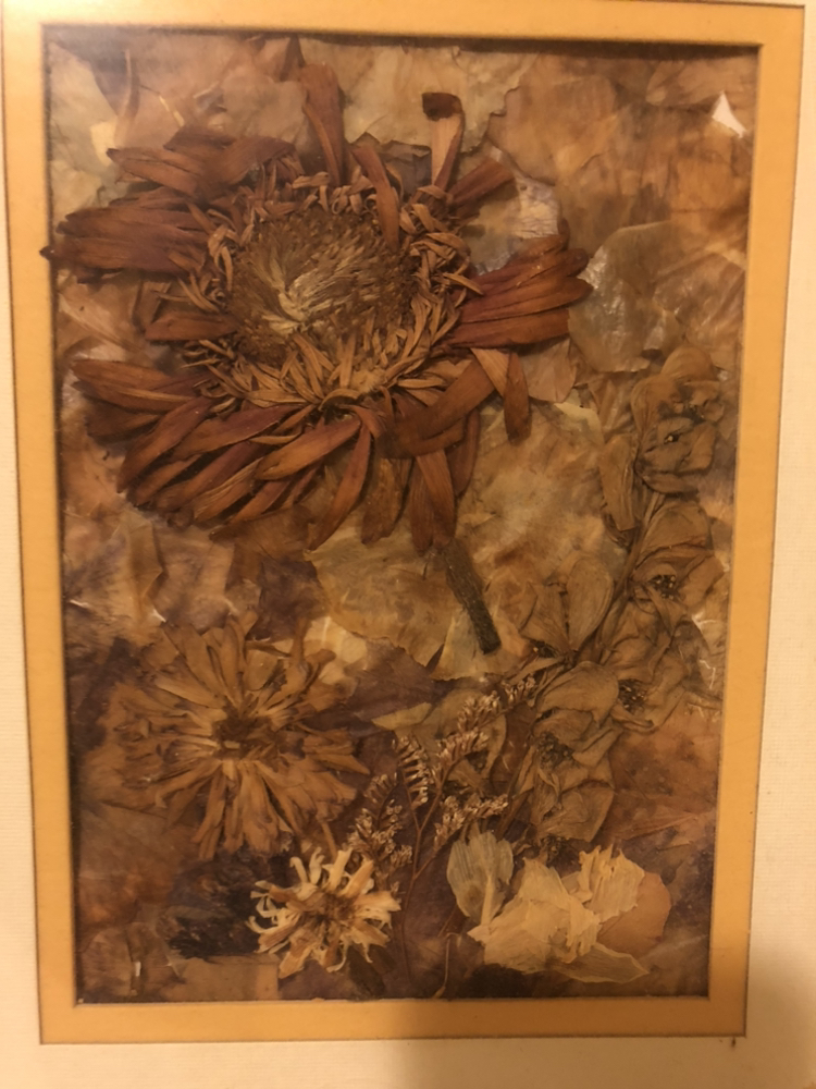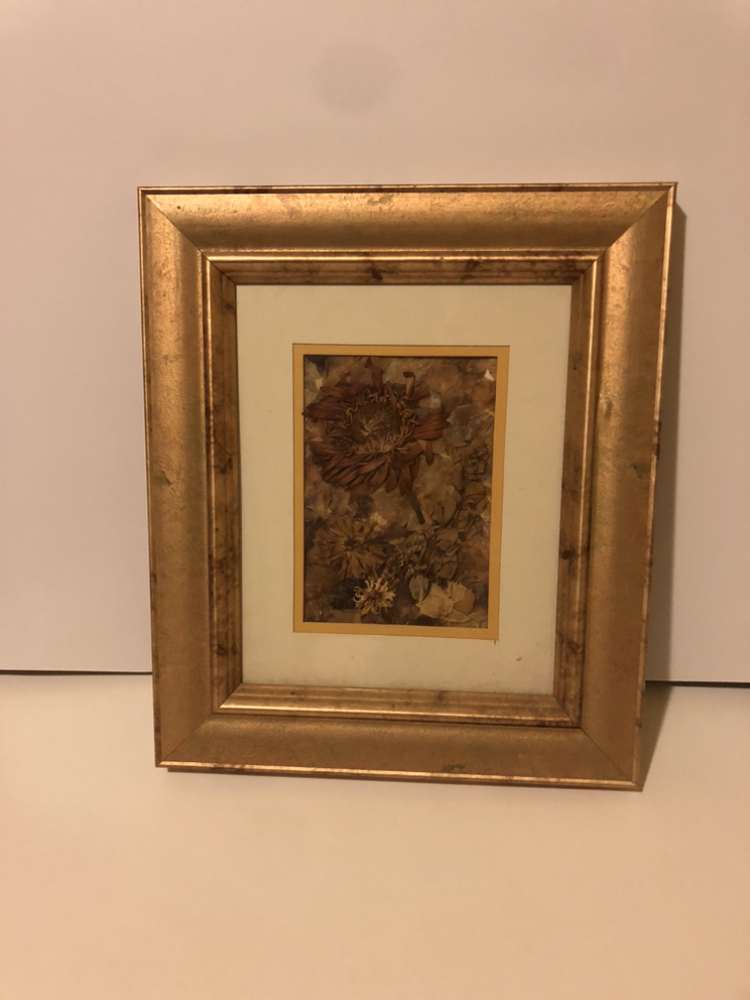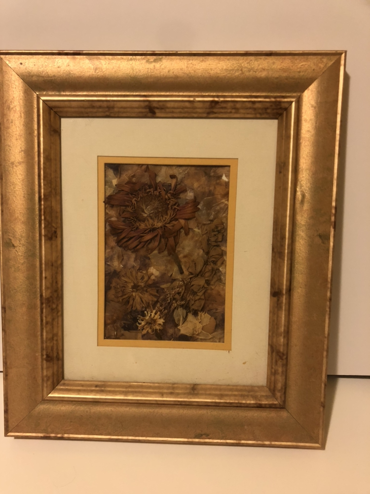 979A Beautiful gold framed picture with dried pressed leaves centred. The frame is solid and is a bit heavy for the size. The back has a board hooks to hang picture length or width. Pick up only. Berry Road ALL SALES FINAL Pick up Tuesday-Friday, Noon until 8pm *Some wknds when pre-arranged.