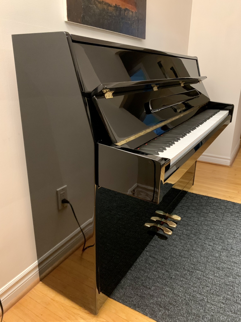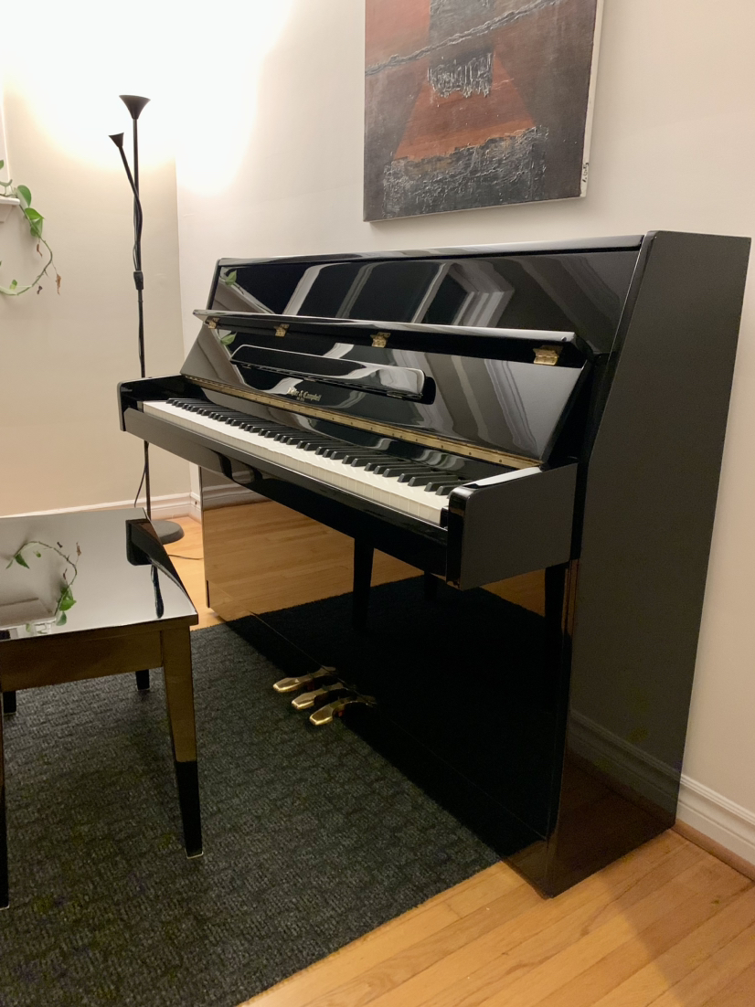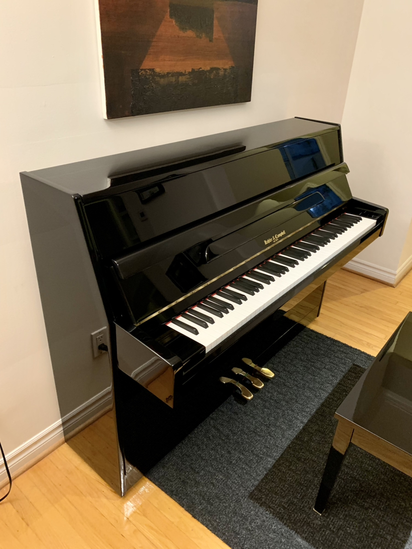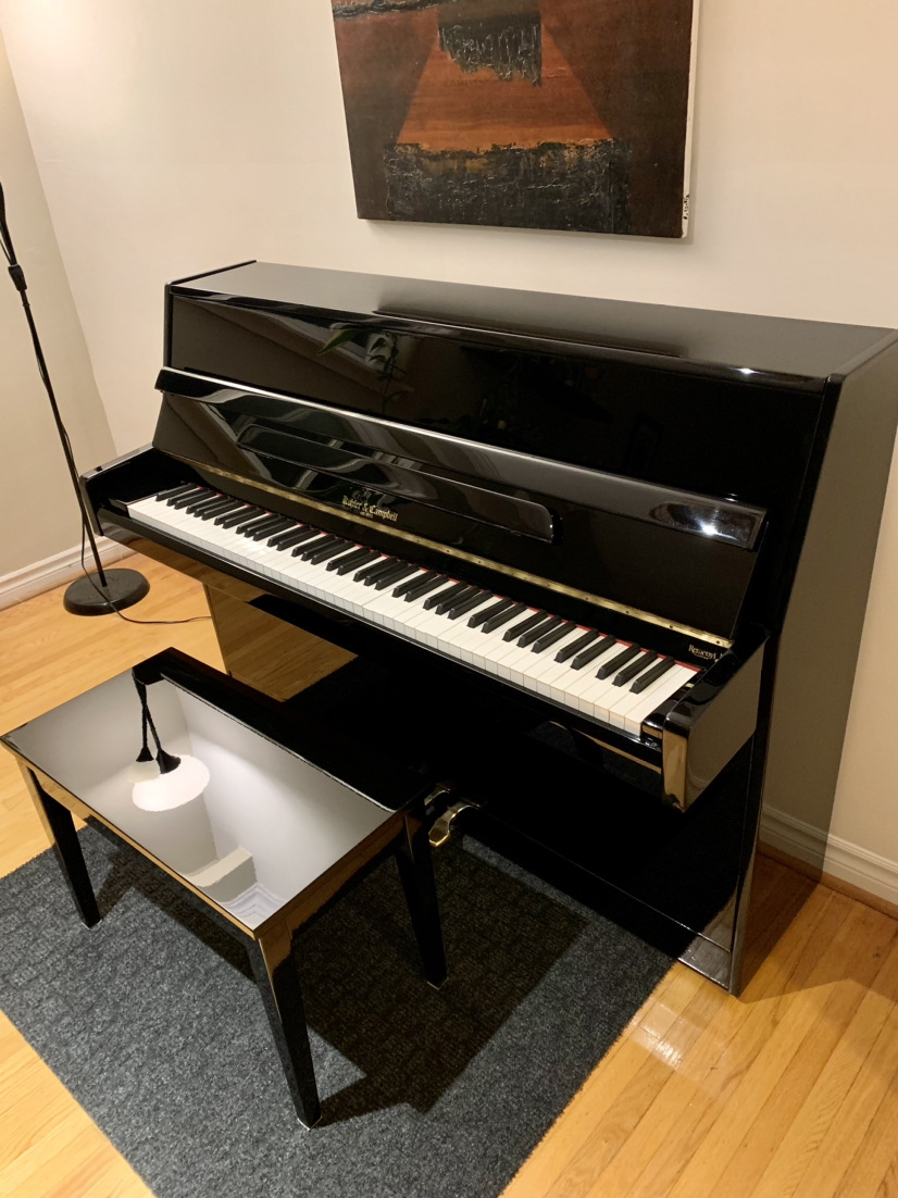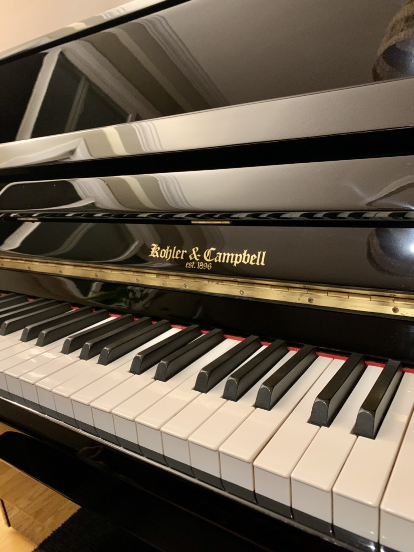 23Kohler & Campbell. Model: KC-108 Built in Korea by Samick Music Corporation 43”-height 57”-width. (3 pedals) This full size 88 note Piano is the perfect blend of elegance and performance. Beautiful high gloss black finish and matching bench, it features a third or Celeste pedal that softens the notes to be played quietly at anytime. It has a nice medium tone, Great tuning stability, recently tuned and serviced. Professionally detailed inside and out. No dents or scratches, like new condition. Perfect for students of any level and/or areas where space is available at a premium. Professional Delivery can be arranged. (Subject to location)