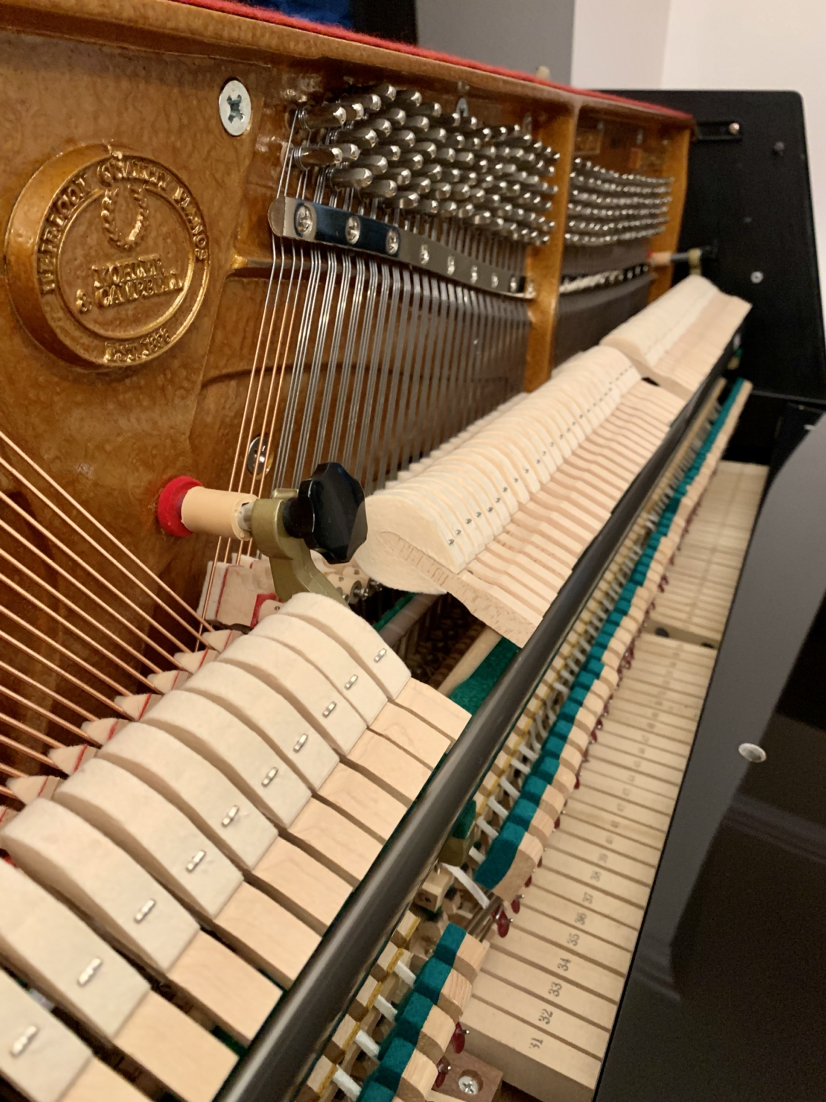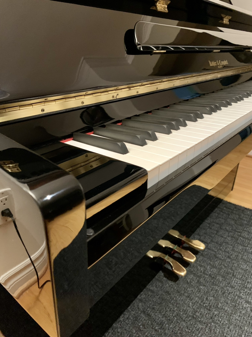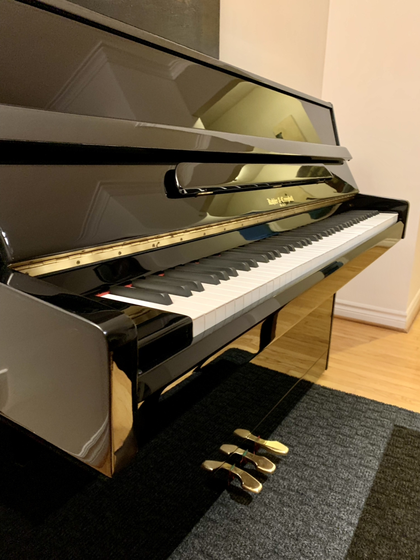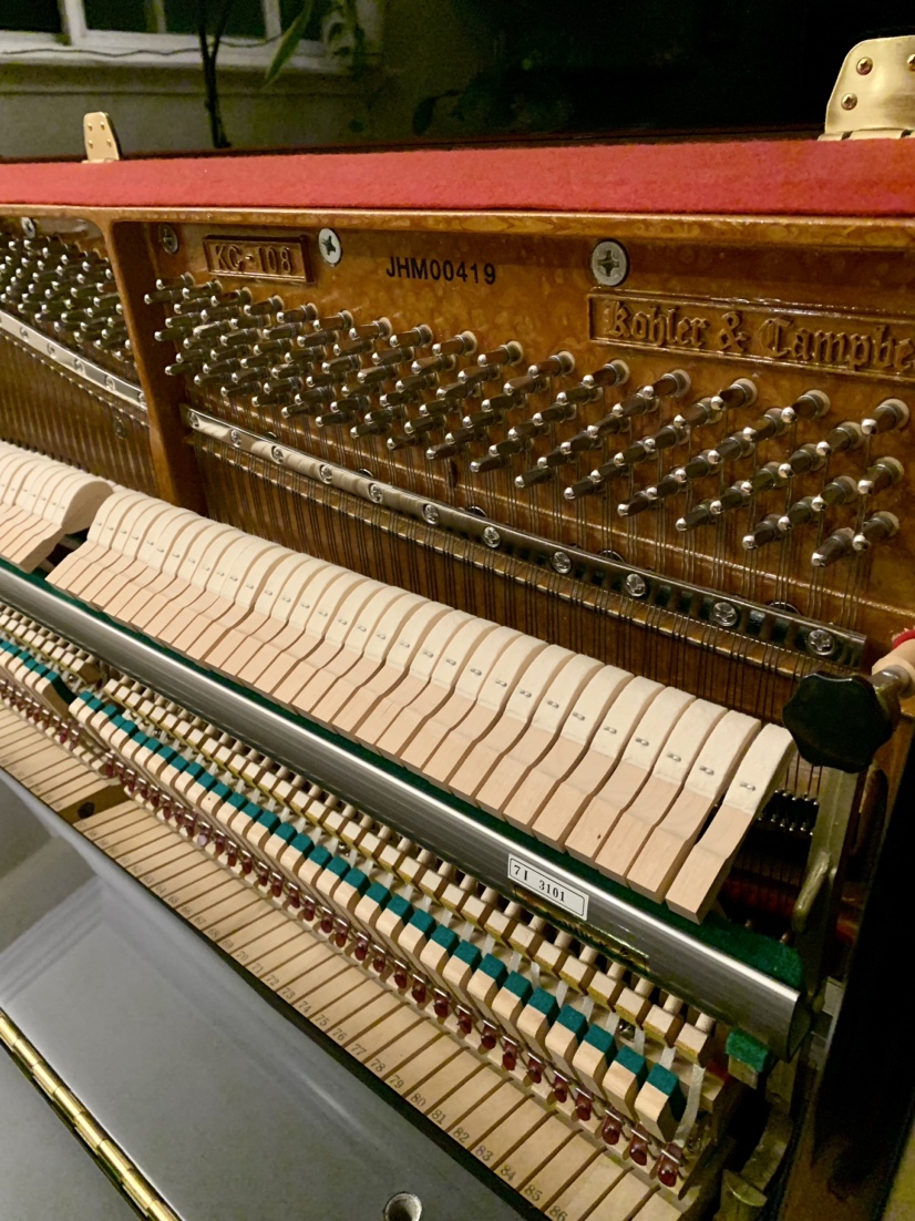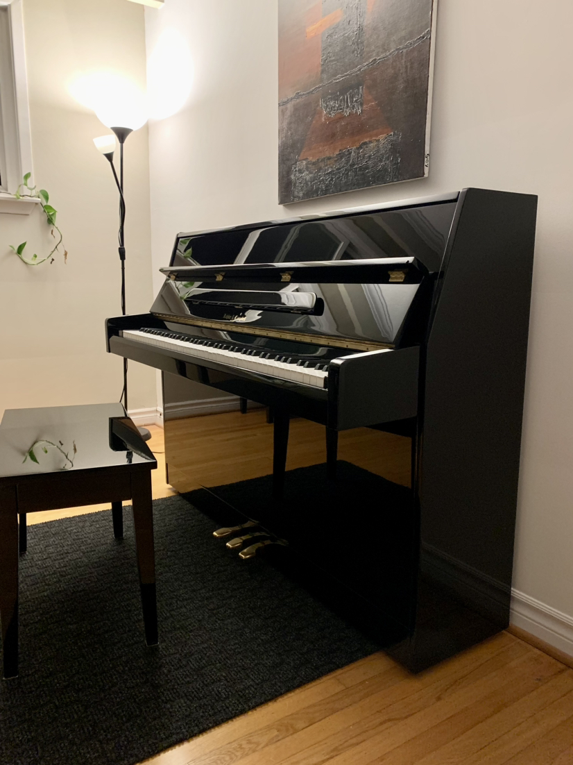 23Kohler & Campbell. Model: KC-108 Built in Korea by Samick Music Corporation 43”-height 57”-width. (3 pedals) This full size 88 note Piano is the perfect blend of elegance and performance. Beautiful high gloss black finish and matching bench, it features a third or Celeste pedal that softens the notes to be played quietly at anytime. It has a nice medium tone, Great tuning stability, recently tuned and serviced. Professionally detailed inside and out. No dents or scratches, like new condition. Perfect for students of any level and/or areas where space is available at a premium. Professional Delivery can be arranged. (Subject to location)