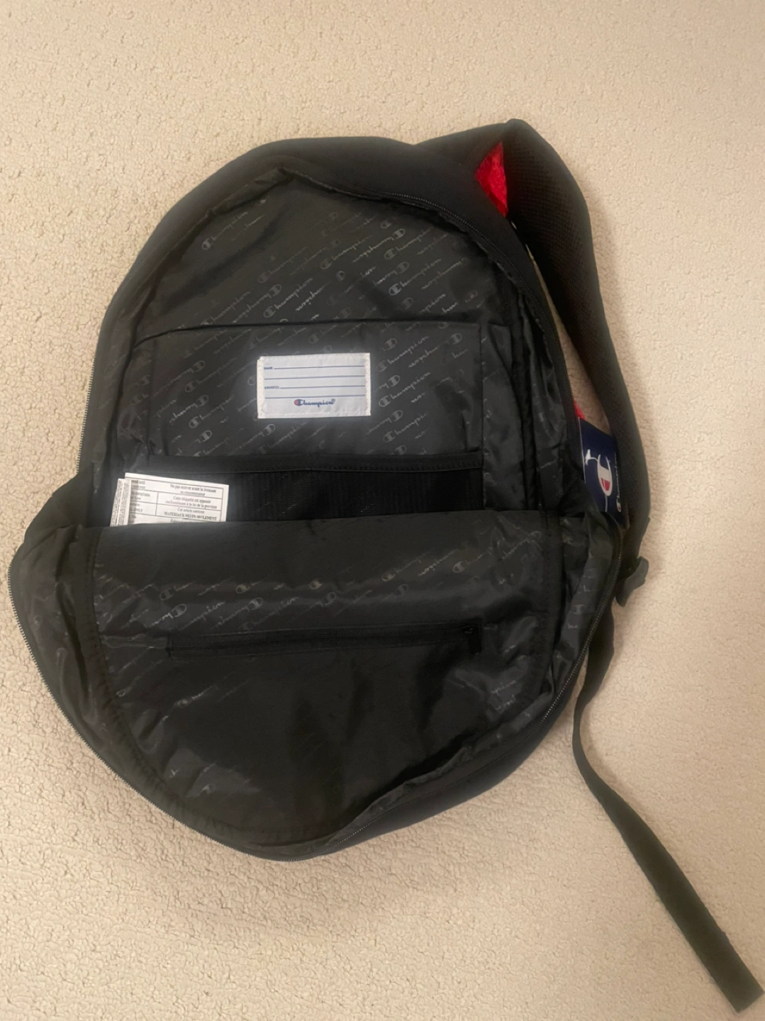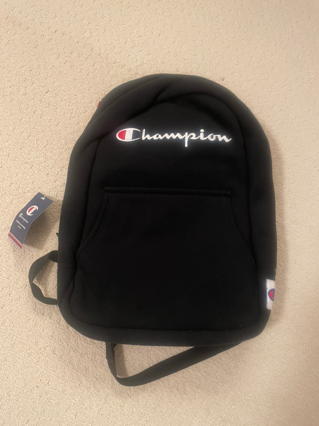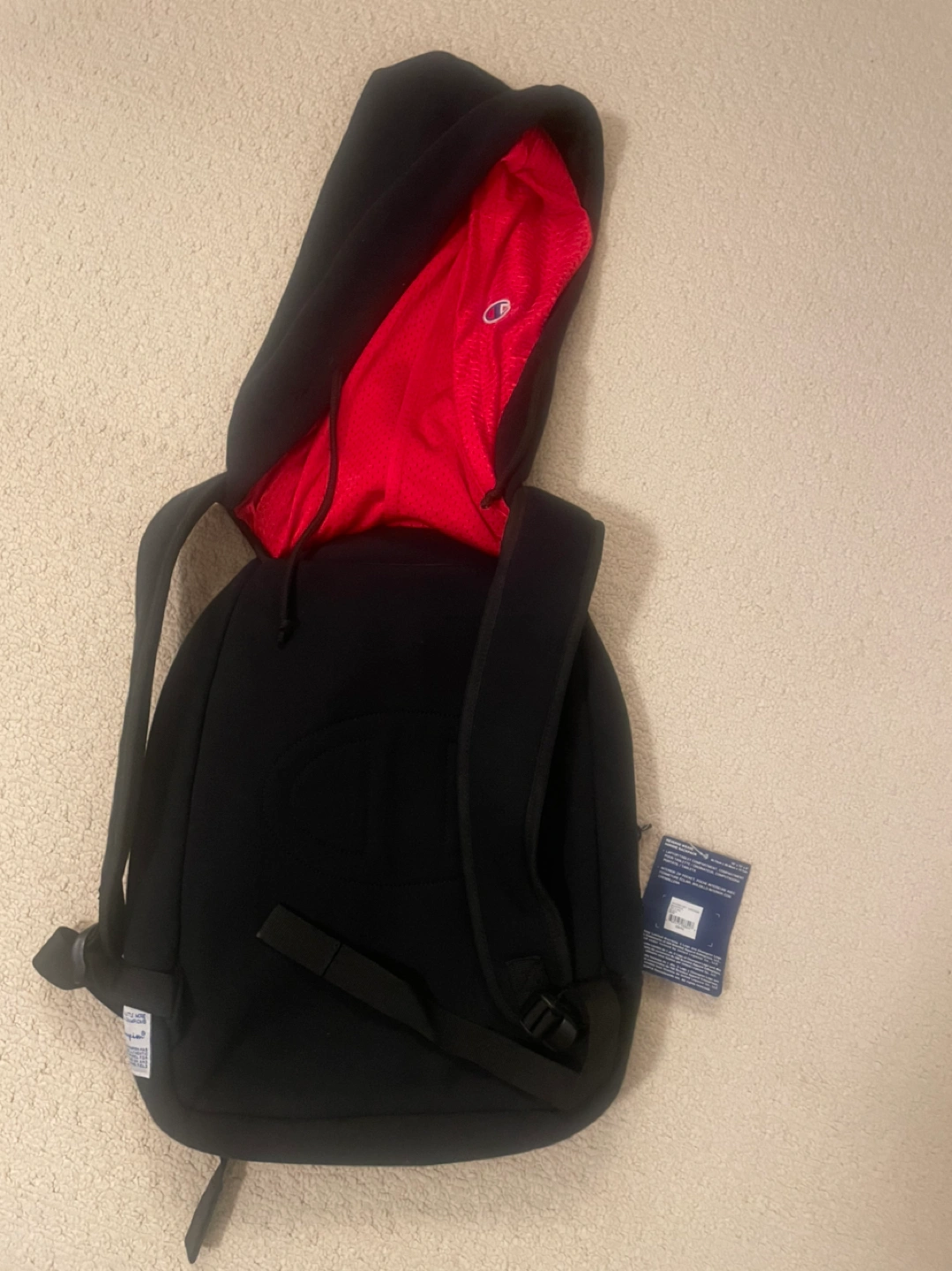 Brand new with tags “Champion backpack that looks like a hoody. The material outside is a jersey cotton with a front pouch. The backpack comes with a hood attached to it. (The hood part can be tucked in if desired)