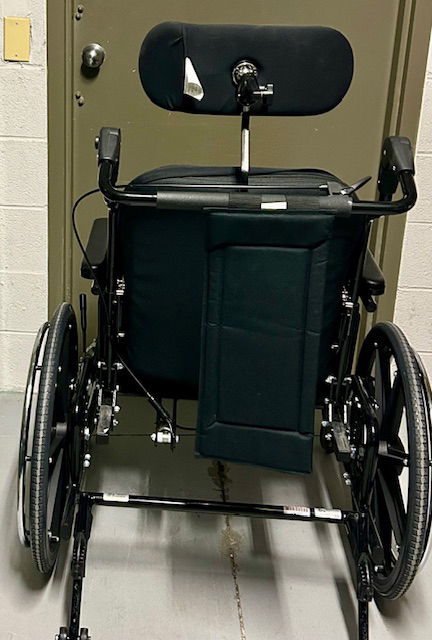 Excellent condition. Includes Roho cushion (10 x10”), padded calf panel (18”), angle adjustable foot plates, headrest with multi-axis flex pad-large (16”). This wheelchair was custom assembled and does not collapse. Heavy and sturdy for safety. 250lb weight capacity.