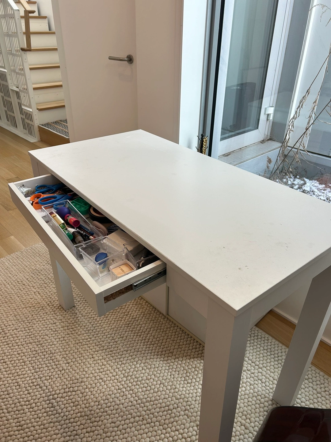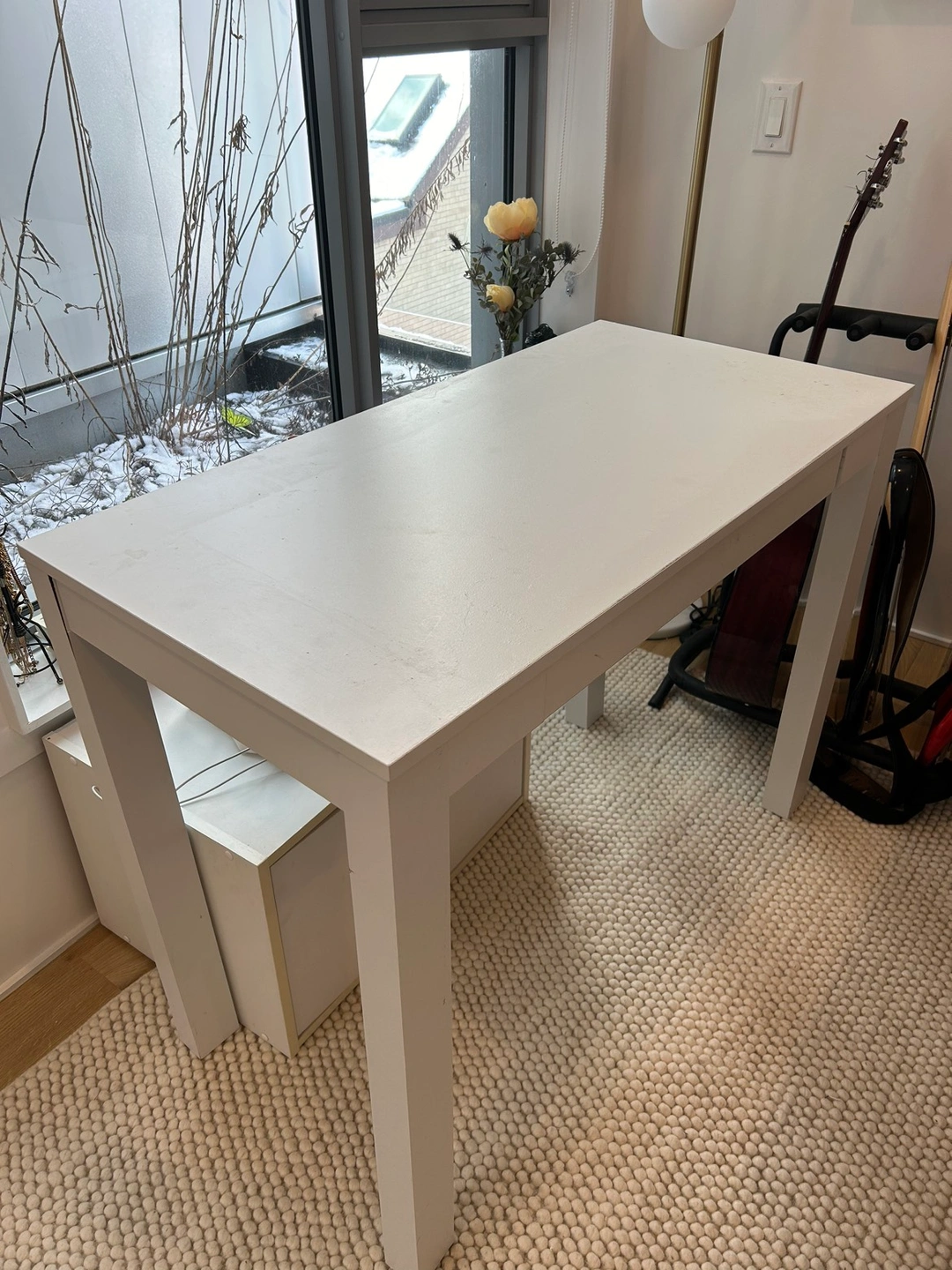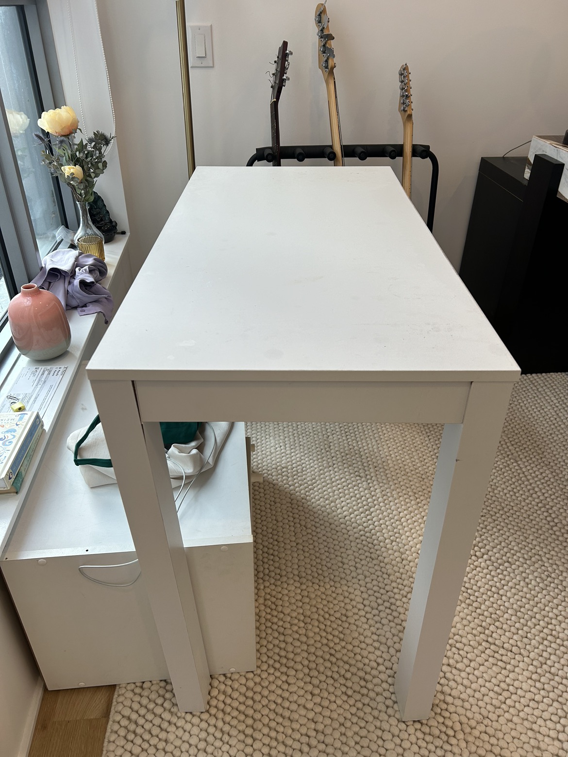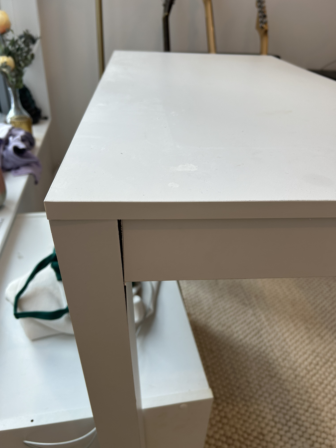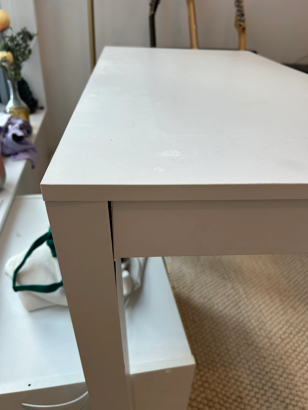 White desk 50D x 99.1W x 76.2H. Some wear and tear, one leg is kind of bending