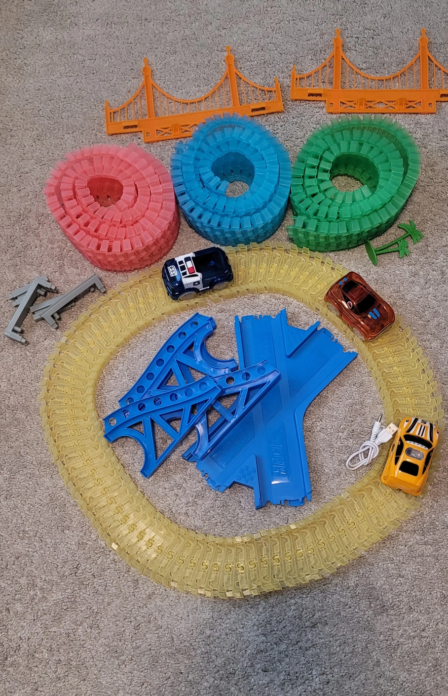 The glow in the dark magic track set comes with 3 cars. The Orange car is rechargeable and comes with a USB cable. The red and blue cars are battery-powered, which is unfortunate not functioning now unless one can fix it. We bought the Orange car separately from the Showcase store. Some parts may be missing from the set, but the tracks are all complete.