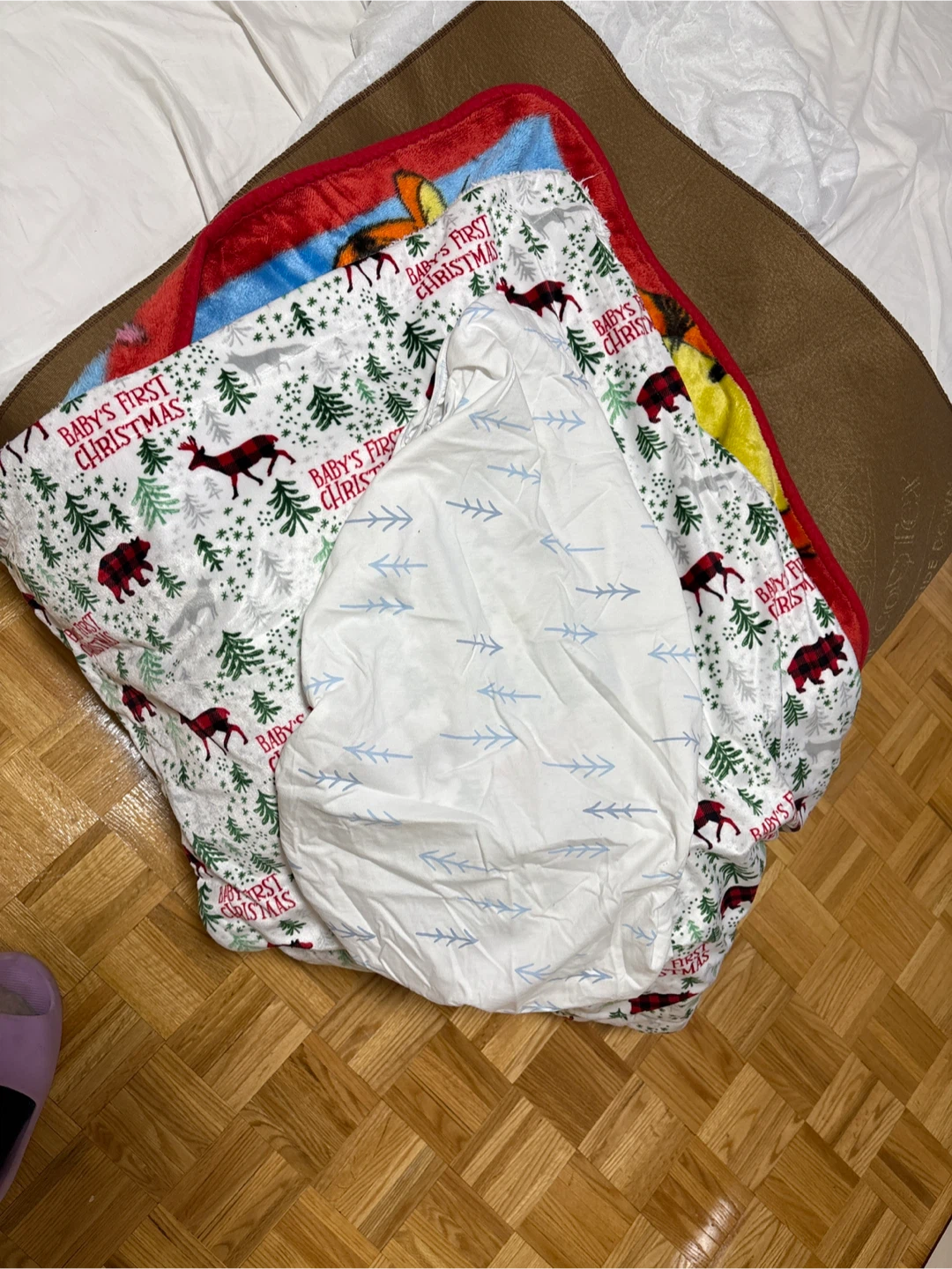 Cozy fleece blanket with a festive 'Baby's First Christmas' theme. Features red deer and green trees, along with a reversible side with blue arrows. Perfect for keeping your little one warm during the holidays!