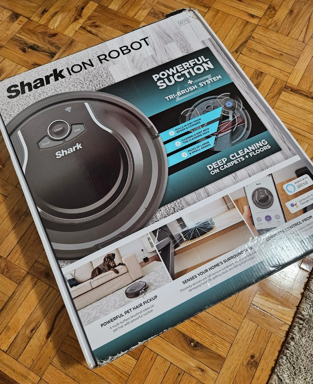 Voice command and wifi connection! Excellent robot vacuum, especially for those with pets and kids! Some cosmetic scratches on surface.