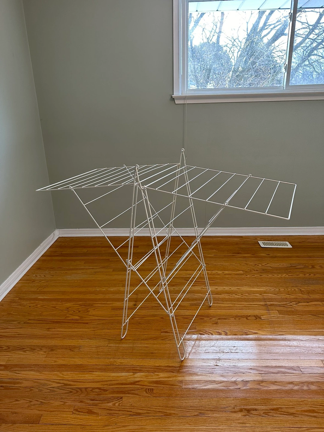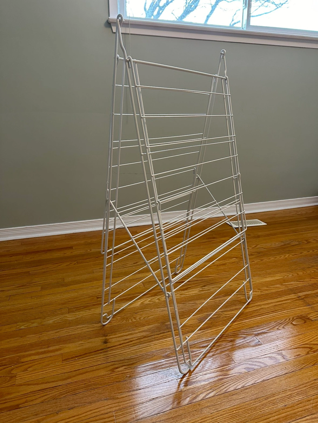 FROST drying rack has a large capacity and can be assembled in different ways depending on what you are hanging. When everything is dry, folded and tucked away, you can fold this rack and tuck it away too.