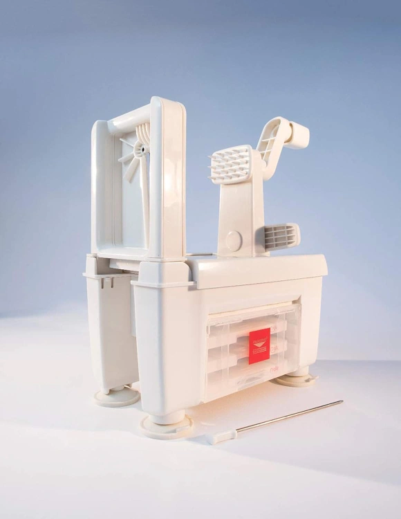 A customer favourite gets even more versatile! Equipped with four blades, this Paderno Spiralizer transforms vegetables into thin "angel-hair" strands as well as spiral cuts, shoestrings & ribbon "noodles." Another plus is an accessory for creating accordion cuts.