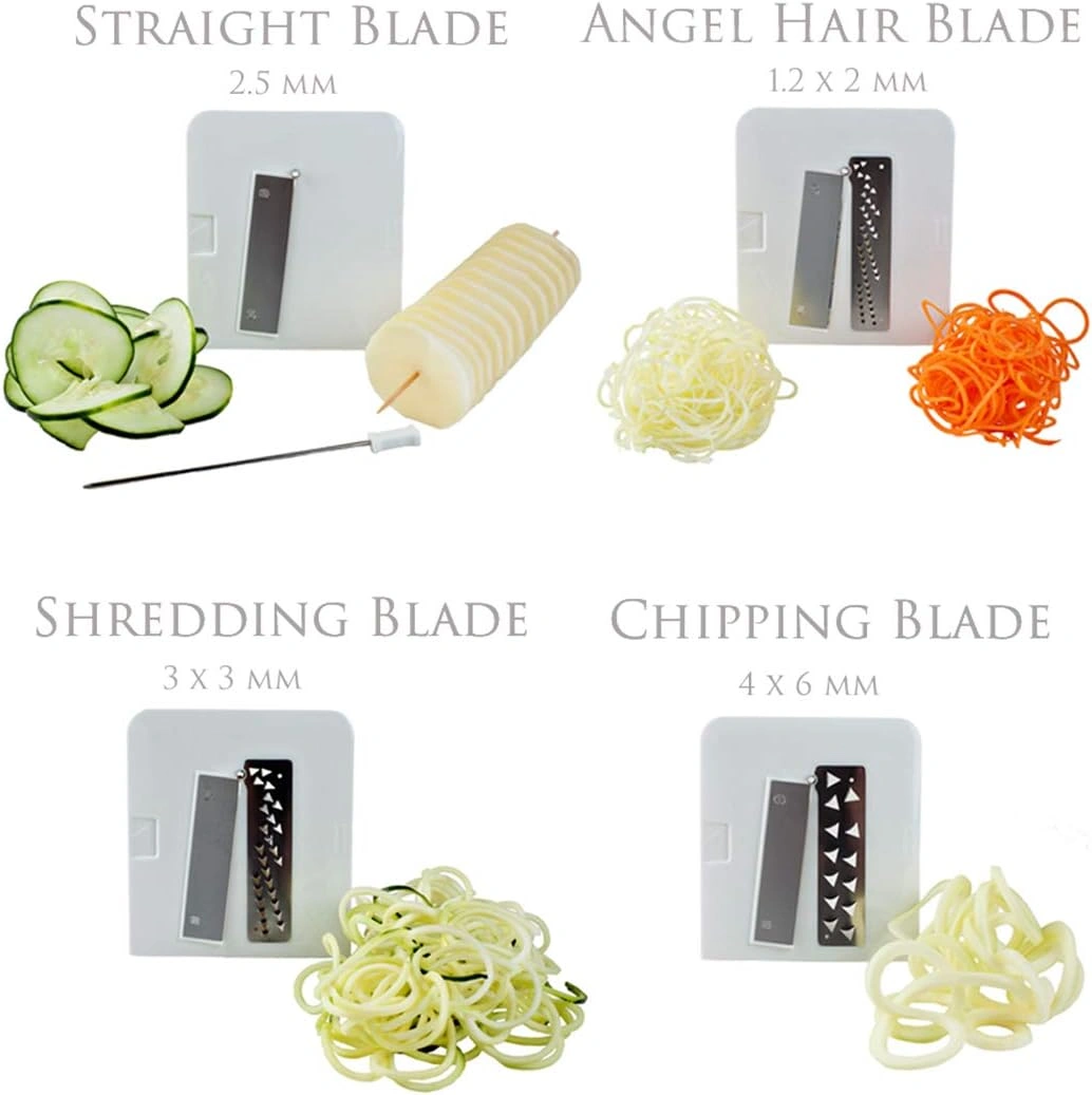 Includes four stainless-steel blades: angel-hair shredder, chipper, fine shredder & straight blade, plus a pin accessory to use with the blades to create accordion cuts.