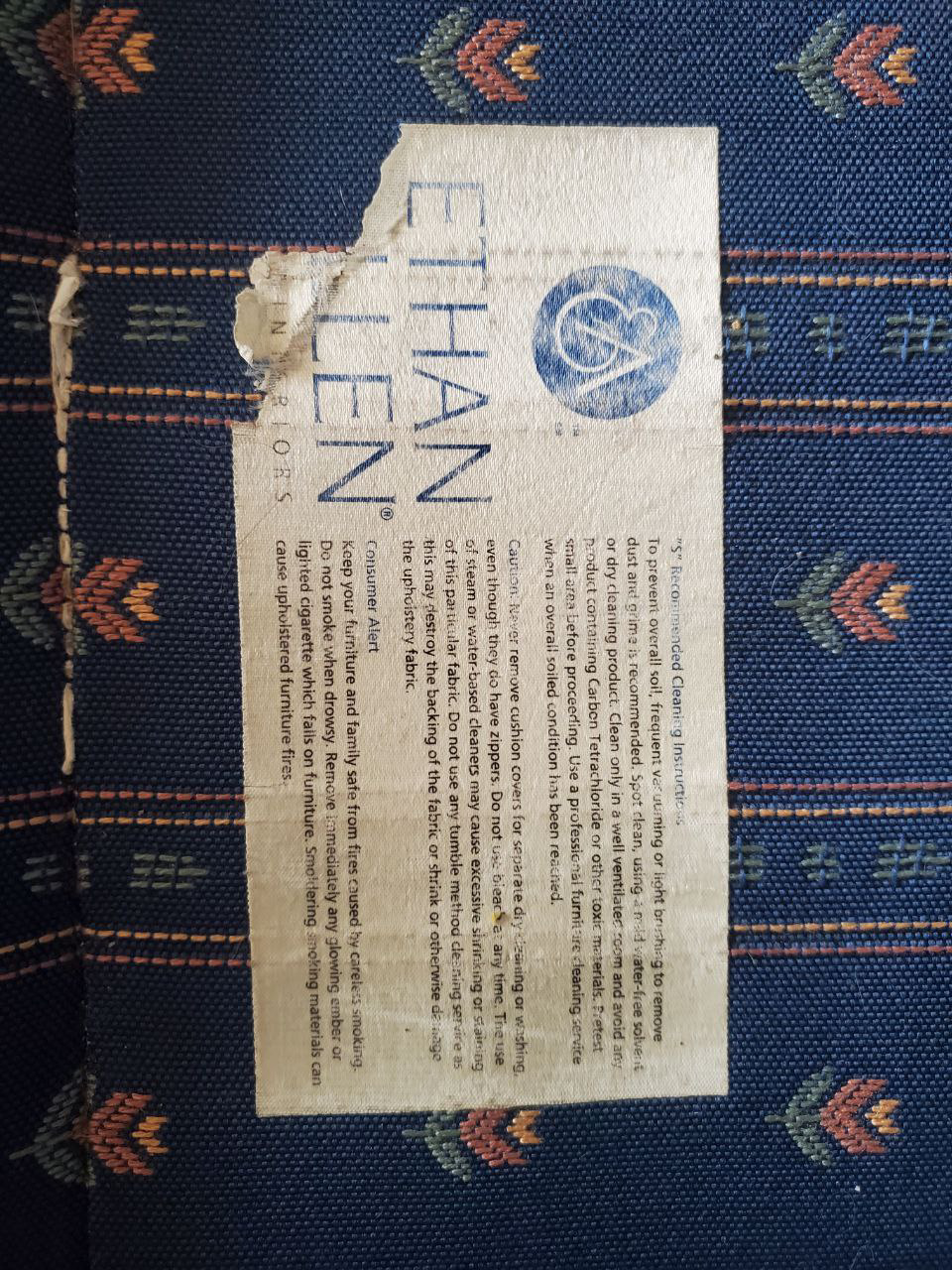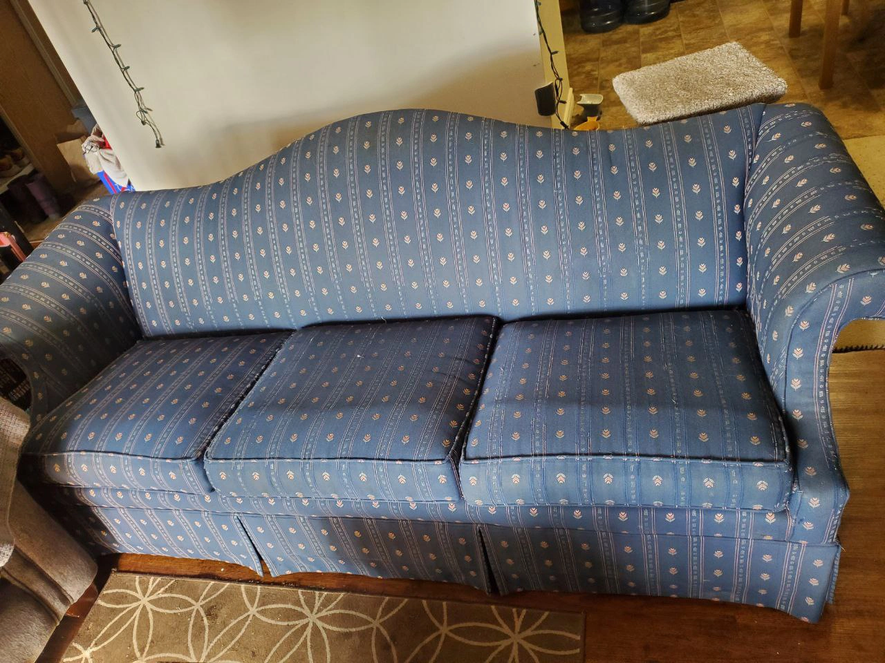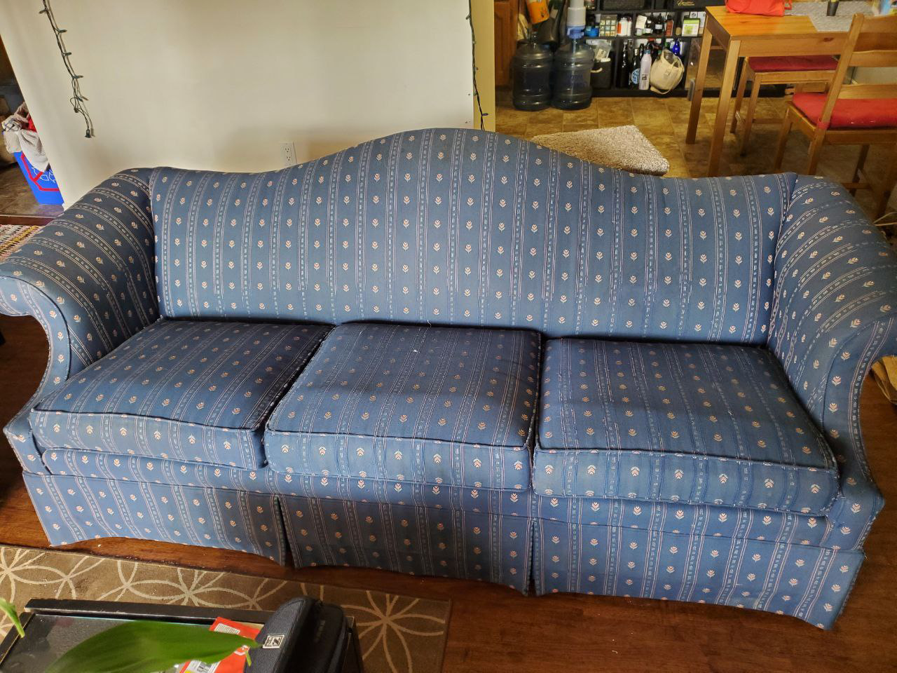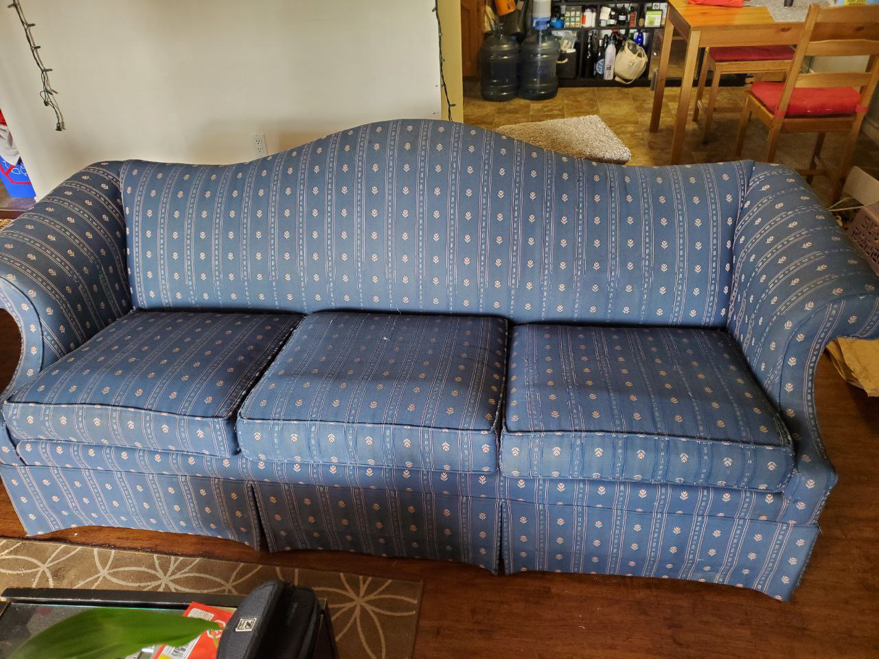 best couch ever! blue, sturdy, comfy and practical. it has the design of amaranth flowers on it. I love this couch, but am moving so I need to downsize.