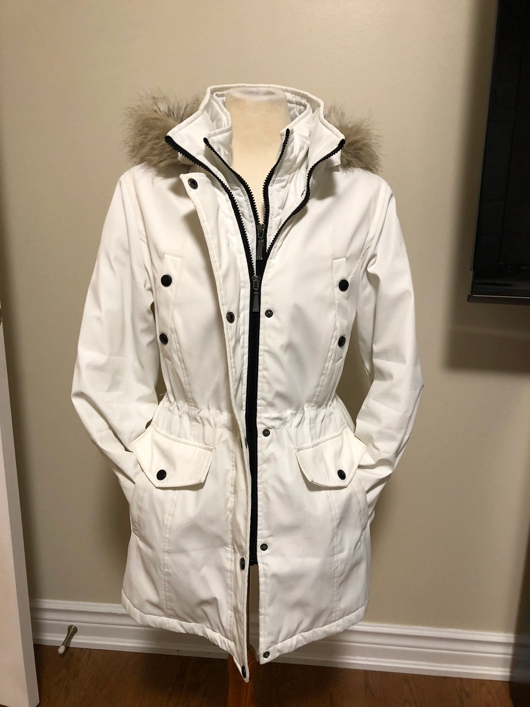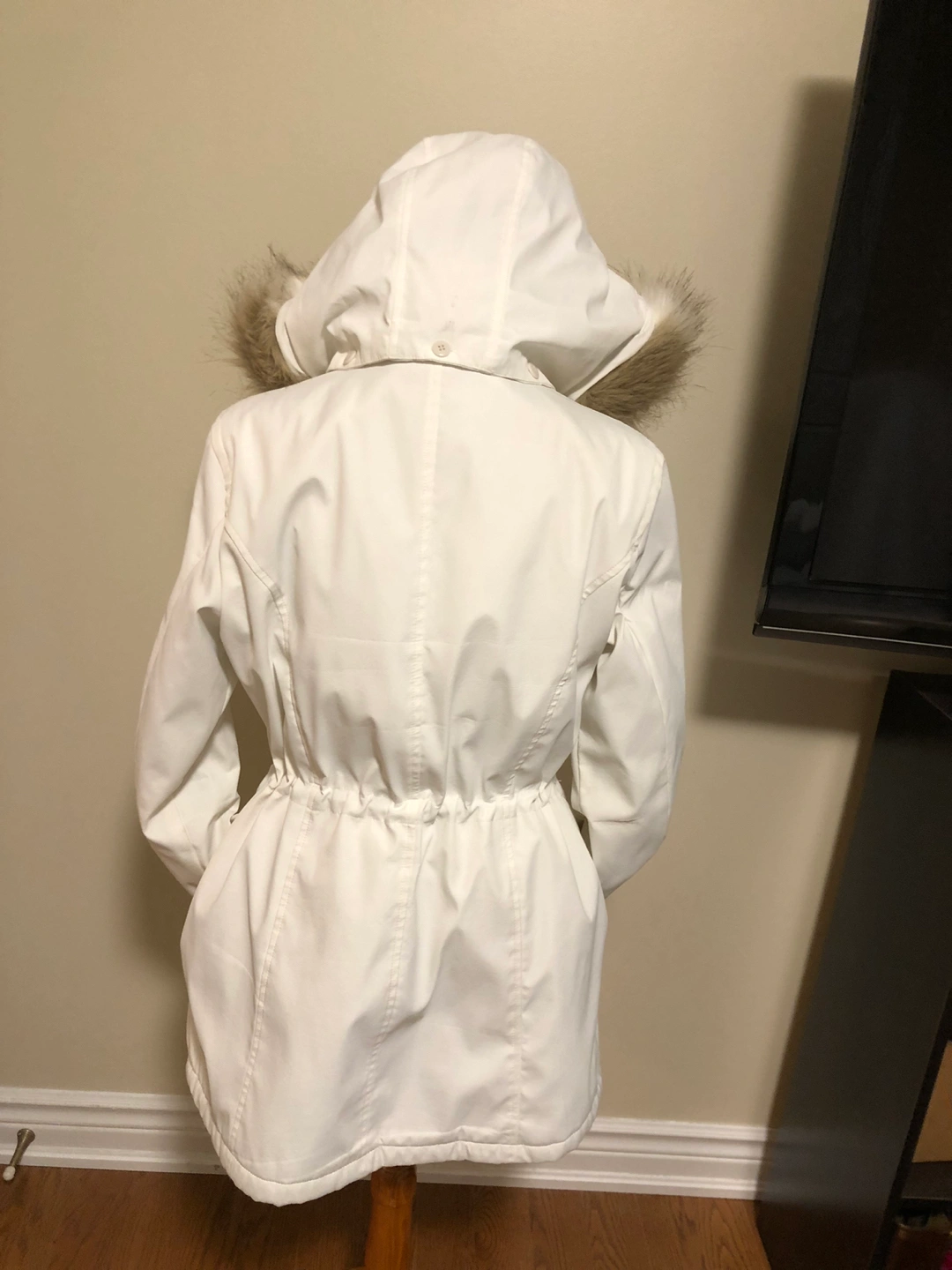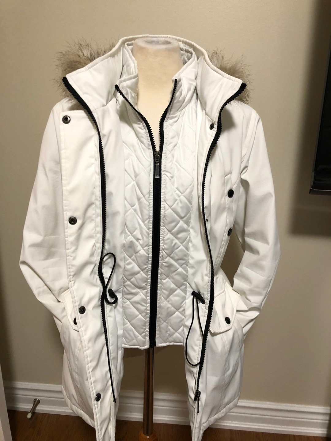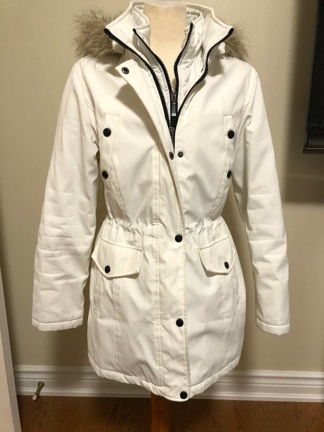 79Winter white London Fog jacket with detachable hood with (faux fur trim), double zipper, inner vest like style, pockets with snaps, breast pockets with snaps and pull toes for a custom/snug fit!