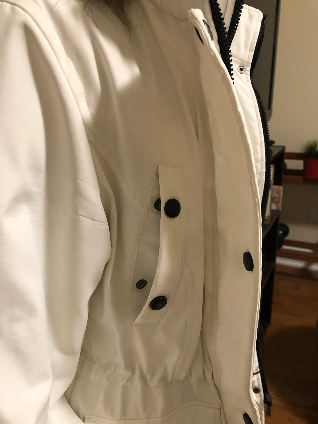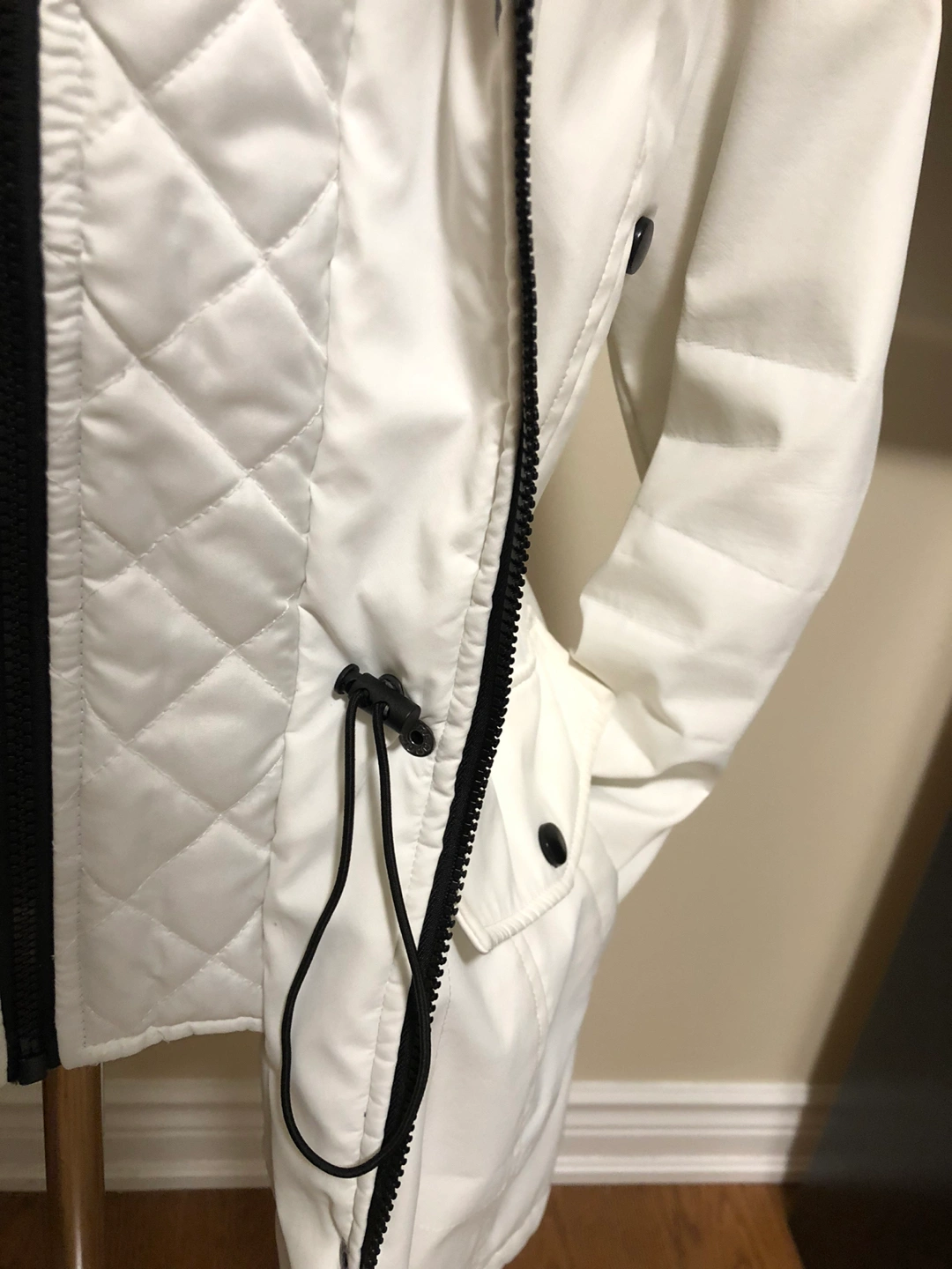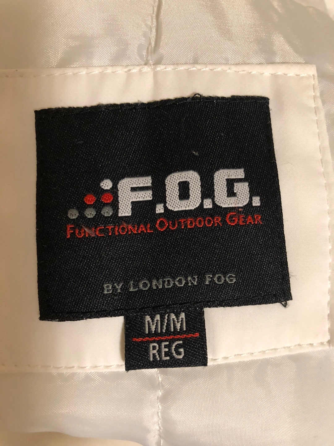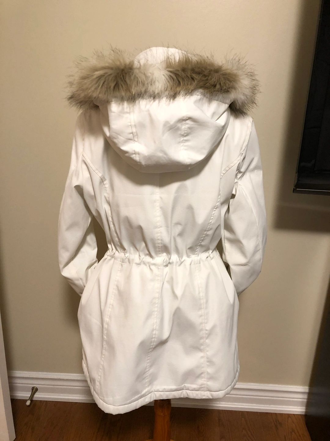 79Winter white London Fog jacket with detachable hood with (faux fur trim), double zipper, inner vest like style, pockets with snaps, breast pockets with snaps and pull toes for a custom/snug fit!