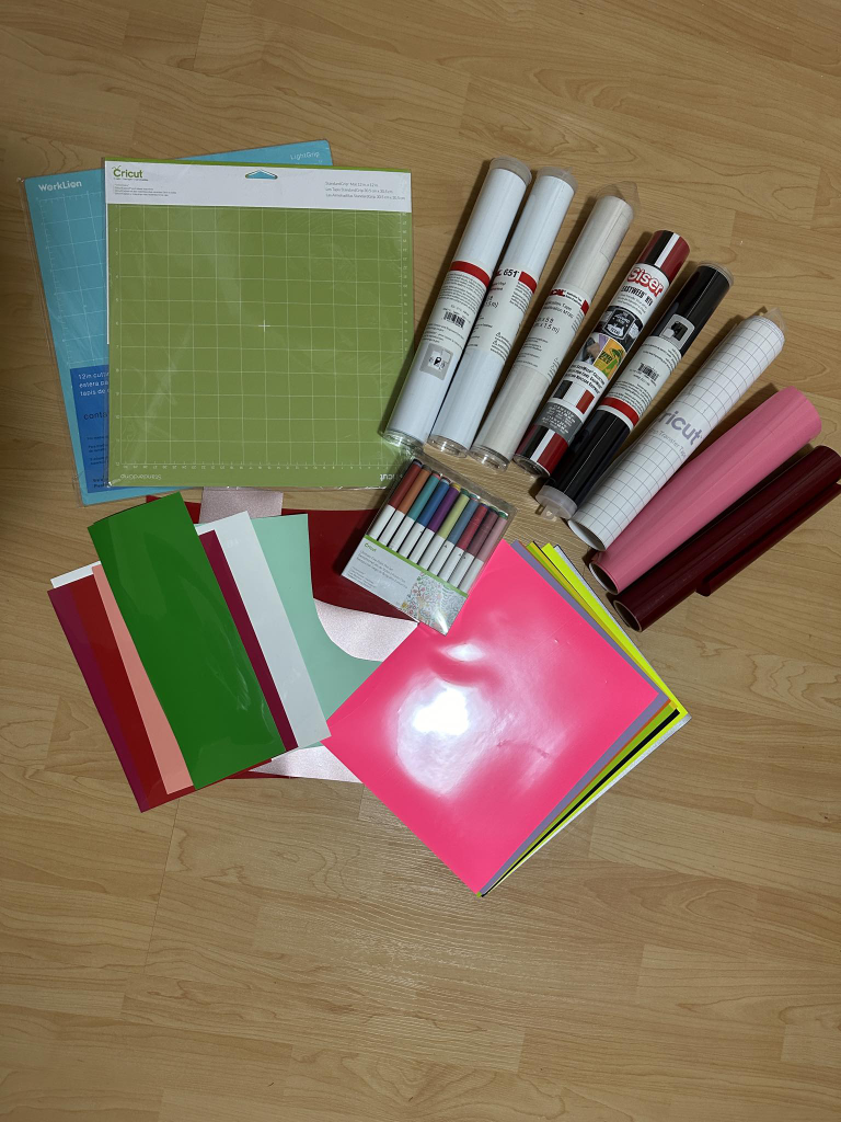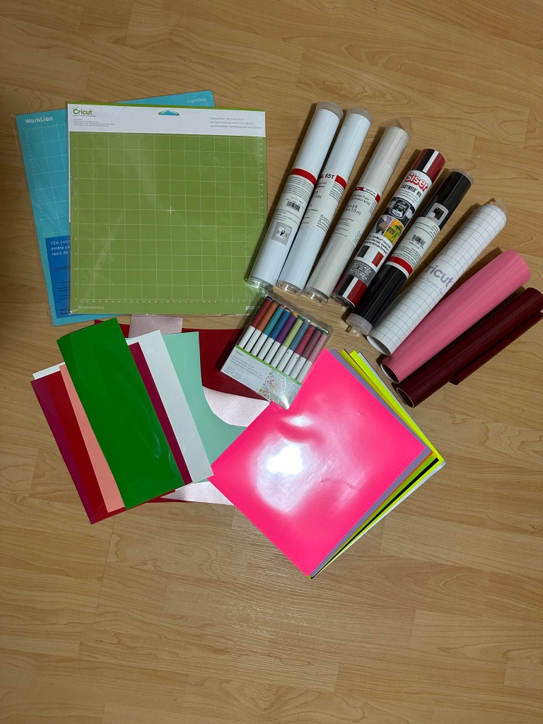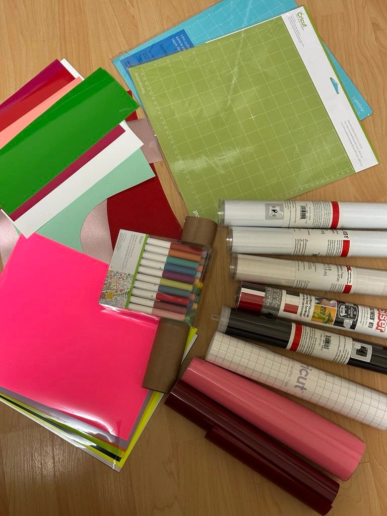 Selling a bunch of my cricut stuff, as I'm not really into it anymore. Stuff is in super good condition with several brand-new items. Includes a pack of cricut markers (used maybe four times?), 2 new mats, transfer tape, and lots of vinyl (both regular and heat transfer). There's over $100 worth of supplies.
