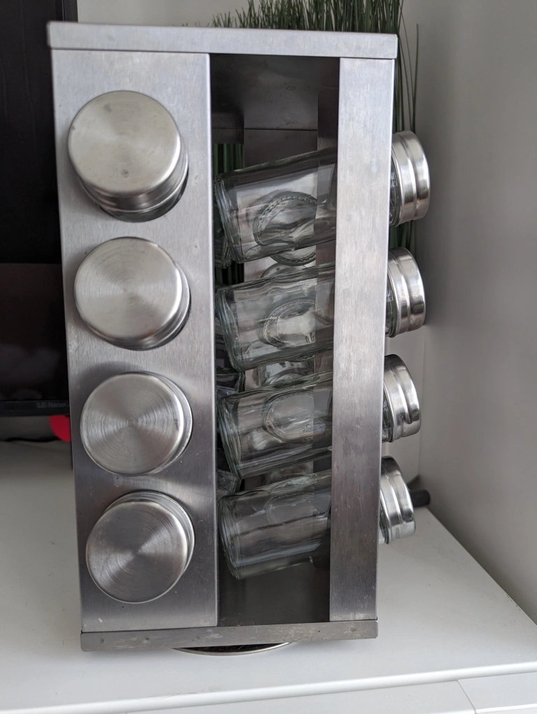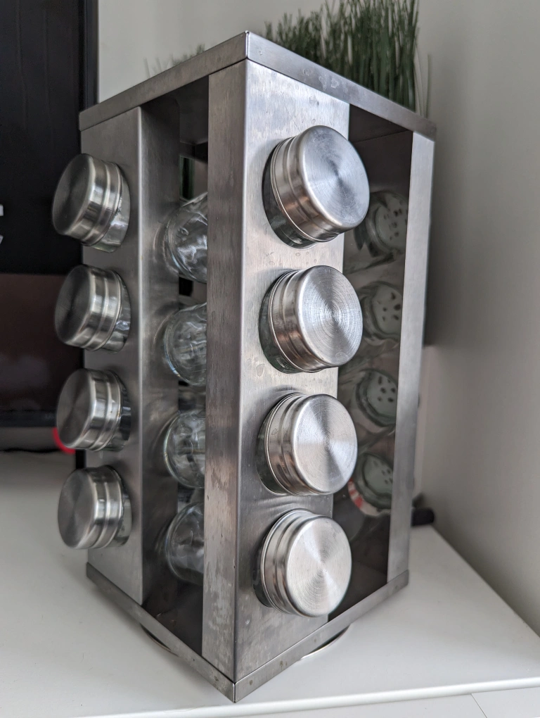The overall spice wrack is in good condition. The jars are all in excellent condition.