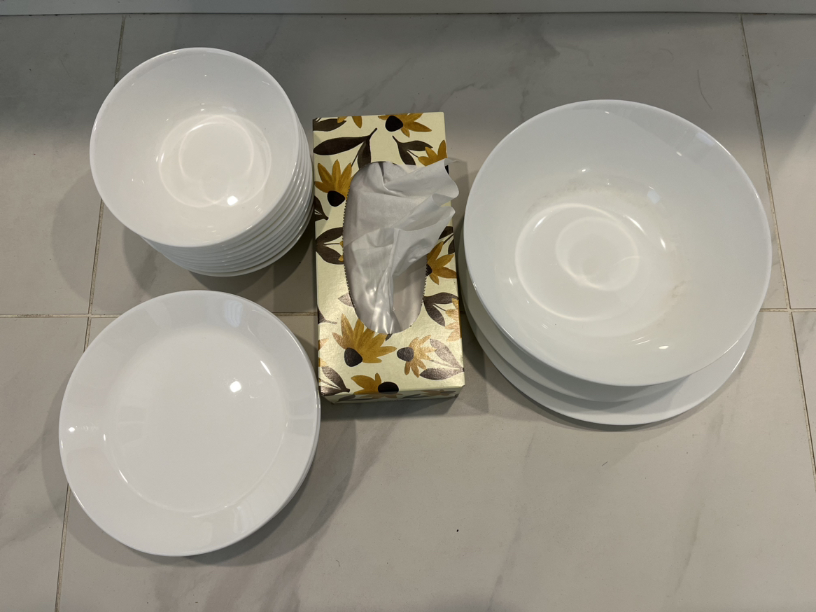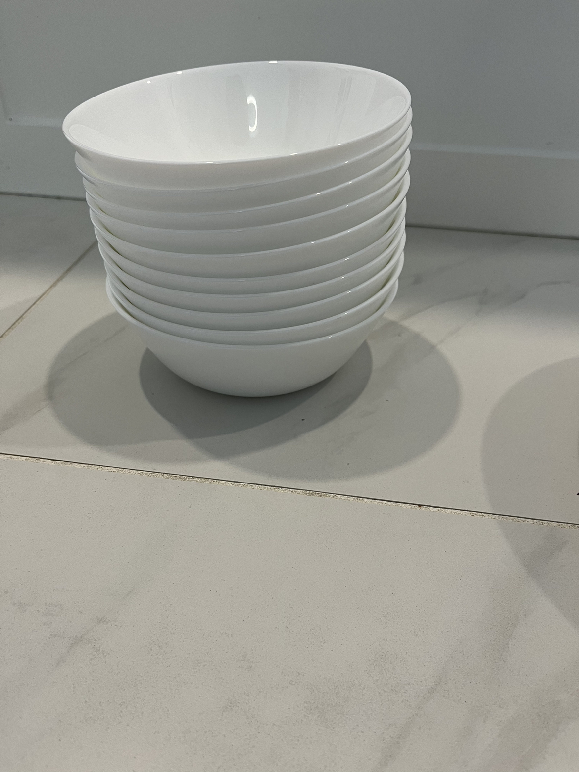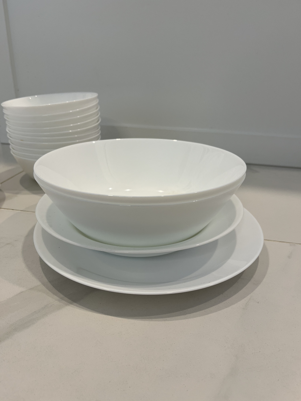 Smoke free pet free home Pick up only. Yonge & steeles Item brought to driveway Selling as lot including: 10 bowls 14 plates 2 large bowls 1 shallow bowl 1 large plate Used but in good condition Seems to be no brand but similar to IKea or Corelle. Simple white design goes with everything. Stackable Great for starter set or college students dorms airbnbs