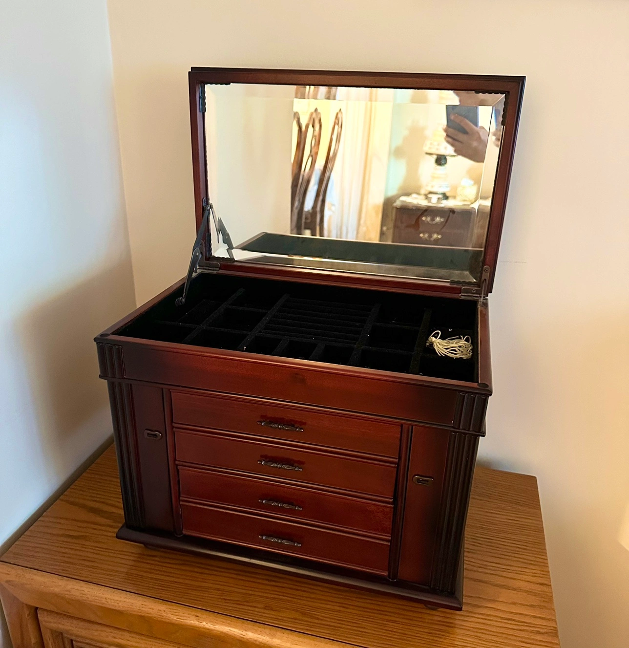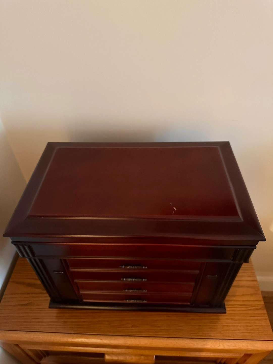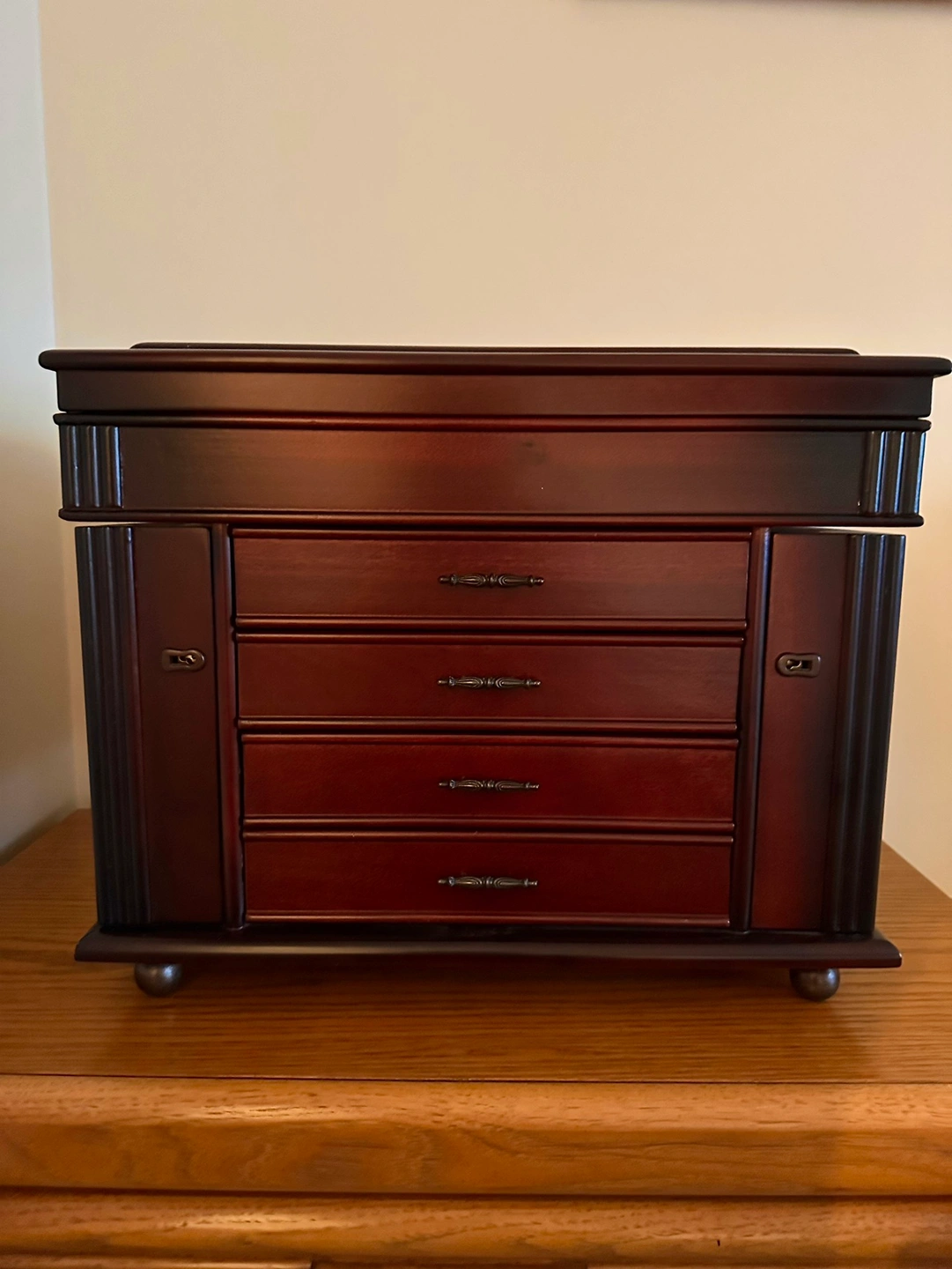 Used, but in great condition, vintage wooden jewelry box. Has a flip open top with interior vanity. Has some nicks and scratches, but overall great condition! Comes with keys to lock the side opening compartments.
