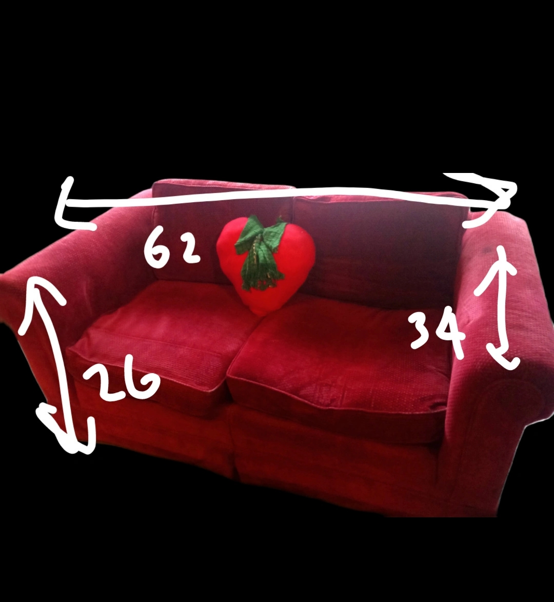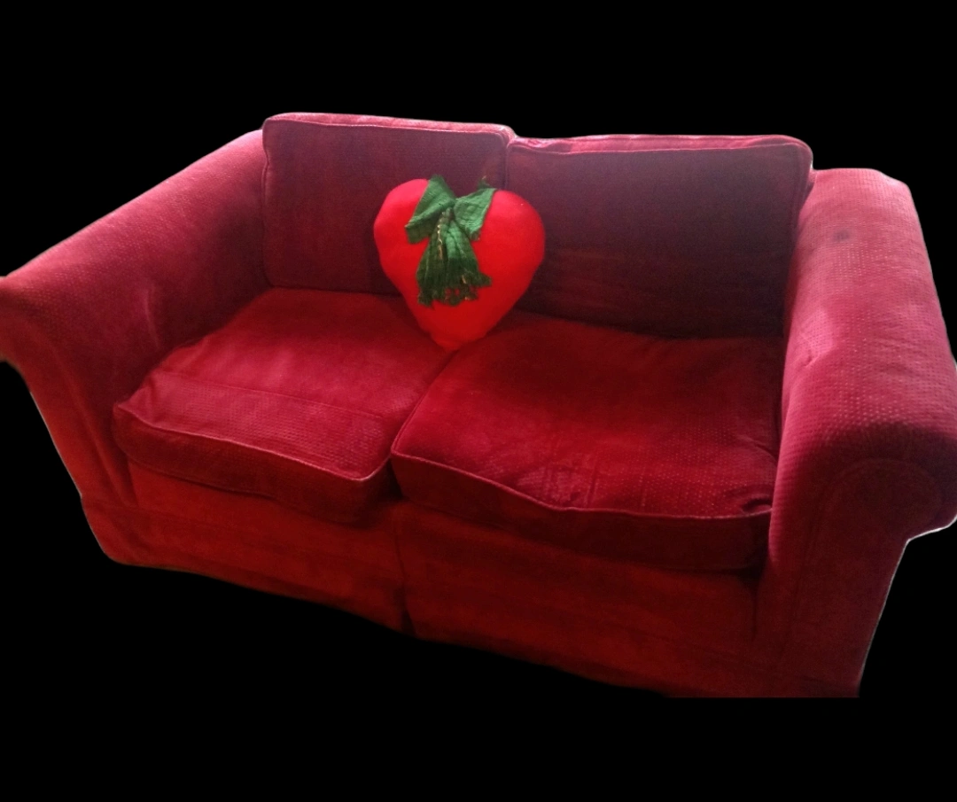 Embrace the vintage 1990s - 2000s charm of this well-loved red and comfy sofa with a storied past. Its aged character and lived-in appeal make it a distinctive piece for those seeking a touch of nostalgia. Has been in the garage for a while, but still very comfortable to sit on.