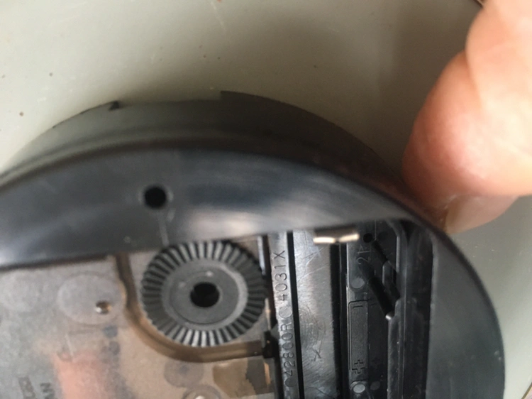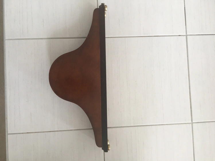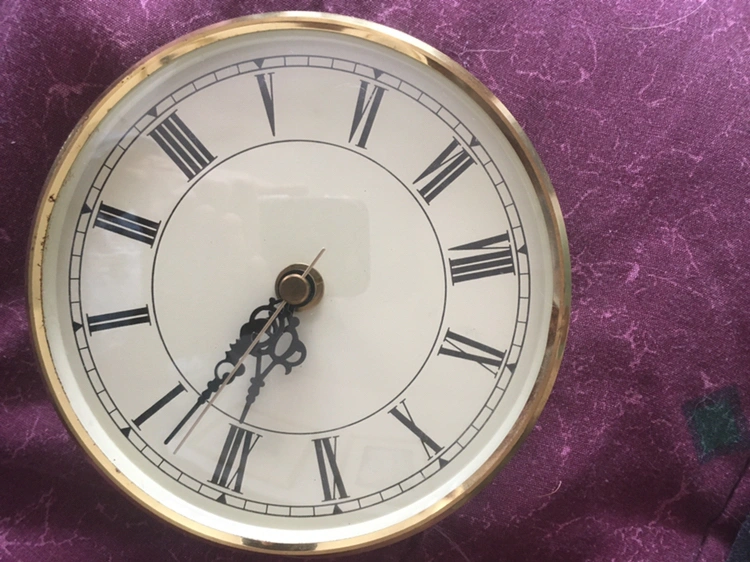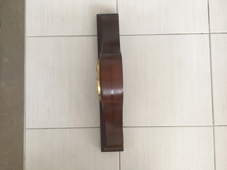 This lovely clock has nice curved lines, rich patina and gold paint trim. The Clock dial sets under glass surrounded by a gold metal frame. The face numbers are in roman numeral style The hands are made of a black metal with nice scroll work. The base of the close sits on 4 feet. It takes double A batteries. It has a stamp of 1992 on the back Overall it's in excellent condition with only very minor edge wear. There is a small dot on the left side can be touched up Otherwise is in great shape. This clock is simply gorgeous. It would look great on any mantle, piano or counter.
