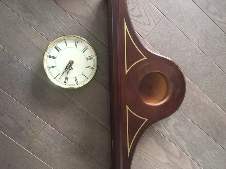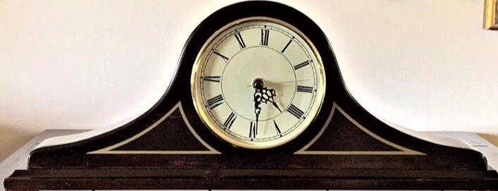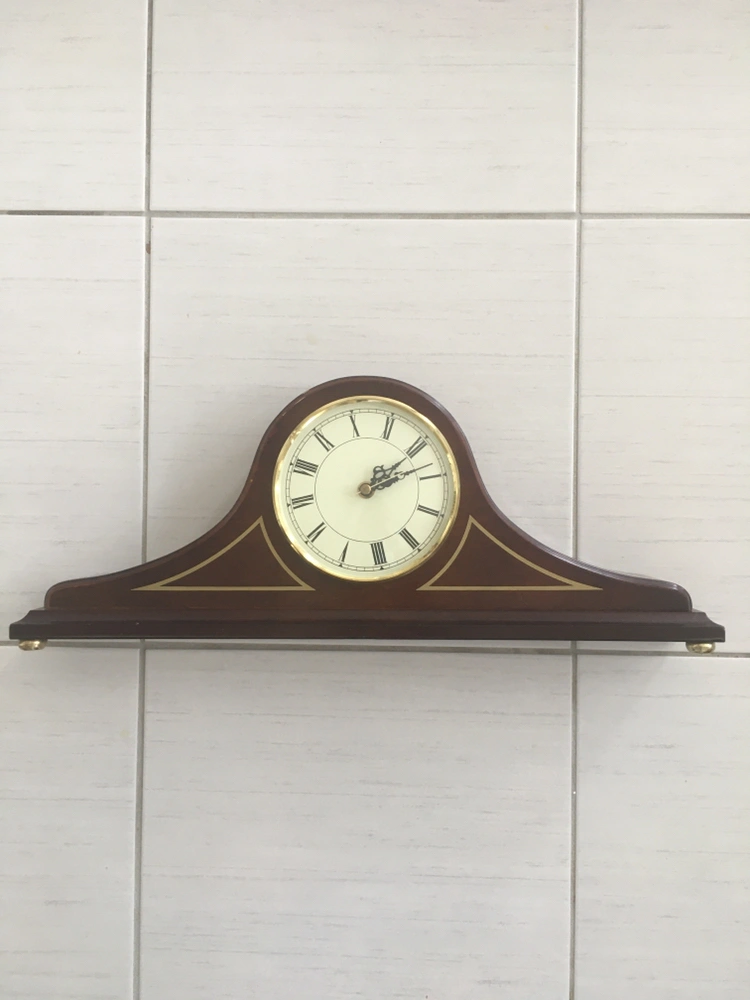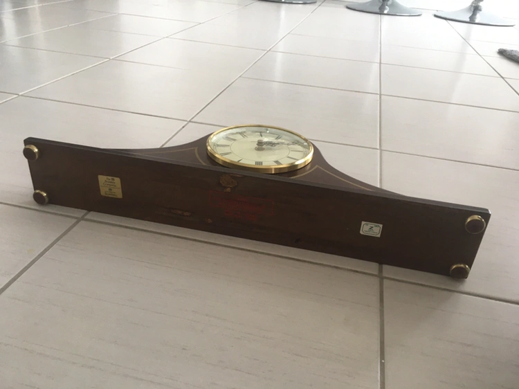 VINTAGE THE BOMBAY COMPANY MANTLE CLOCK, SOLID WOOD, NAPOLEON STYLE, 19" WIDE, 8" HIGH AND 3" DEEP, 5" LARGE DIAL, SECONDS HAND, BRASS FINISH