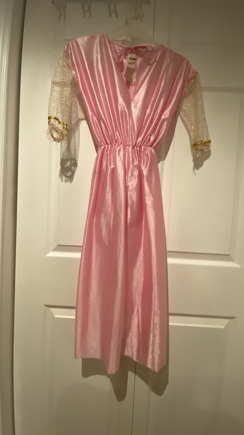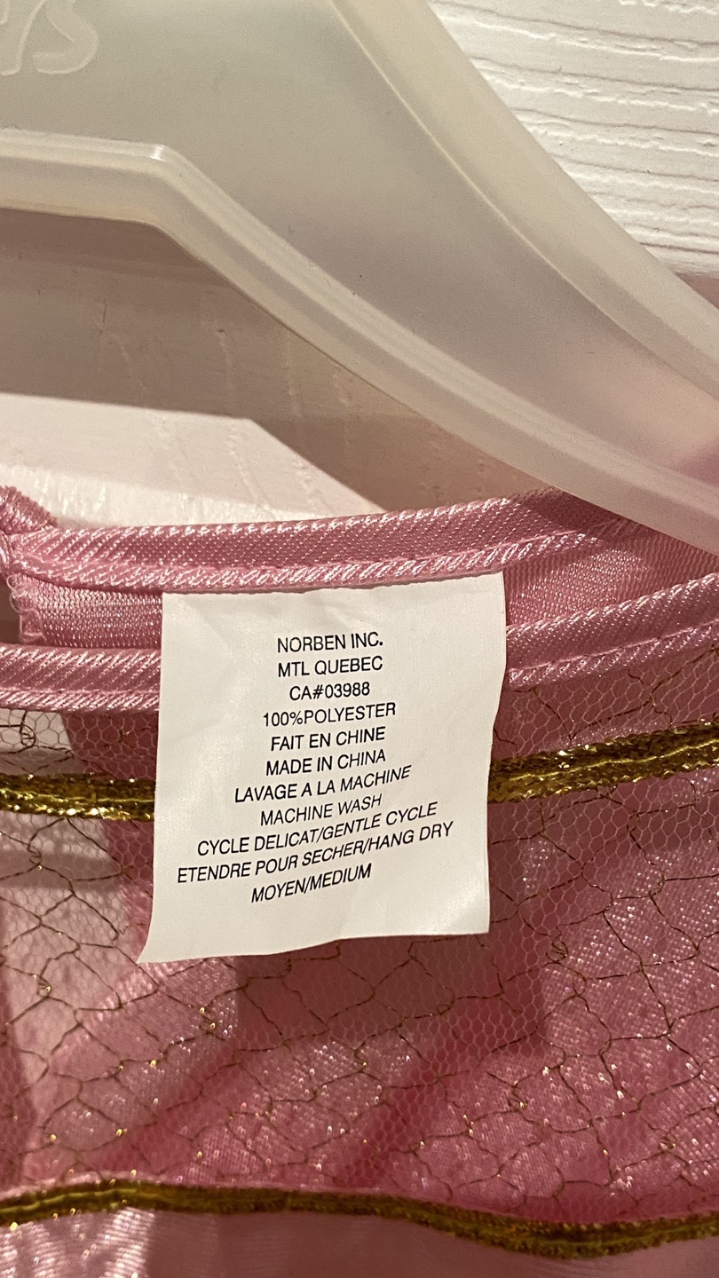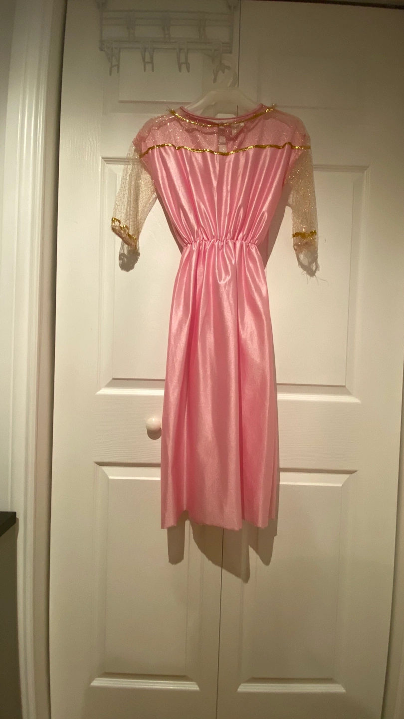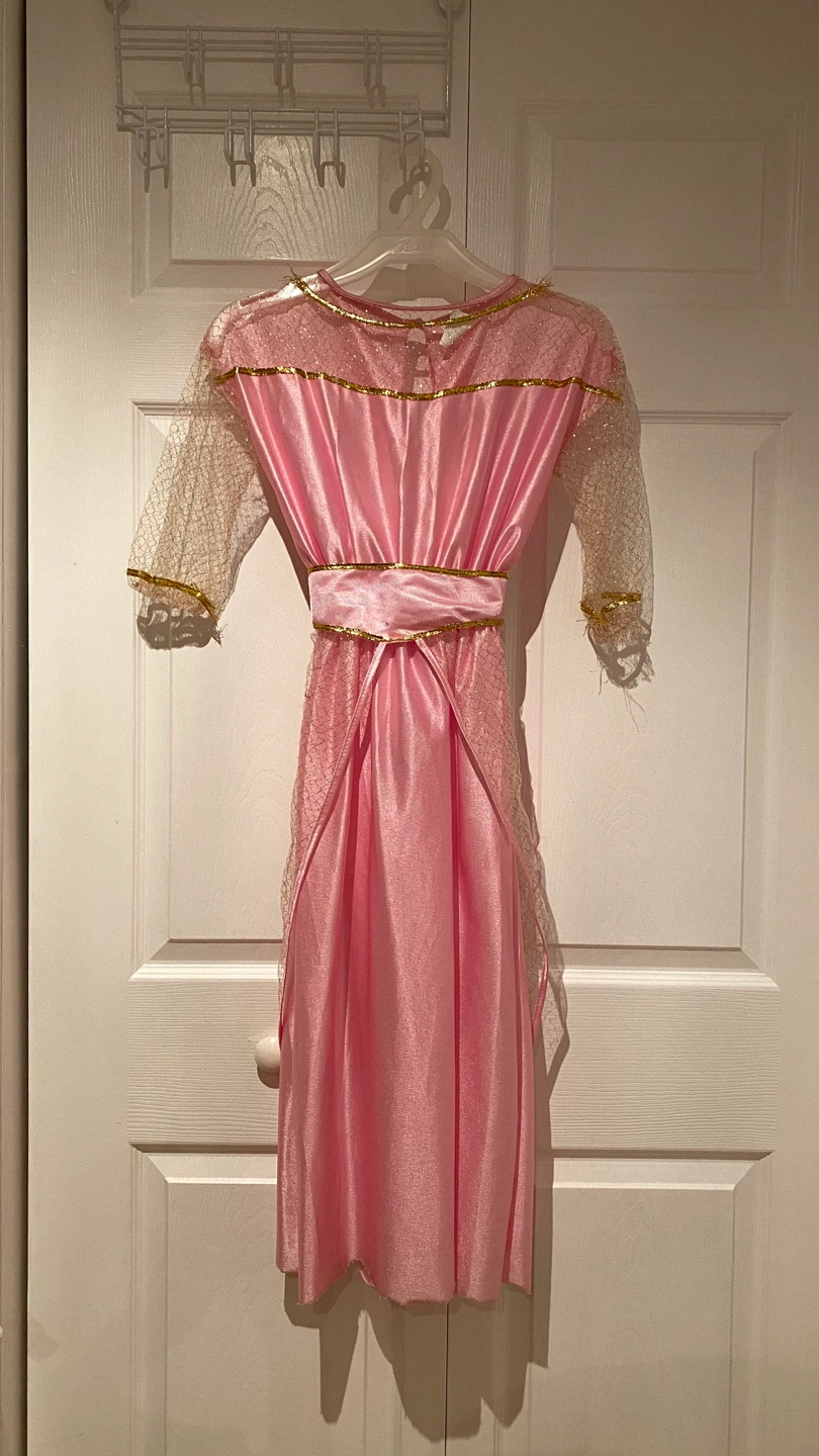 20Girls Princess Costume, Dress, Skirt wrap, Belt and head band, Pink with Gold Trim, Good Condition