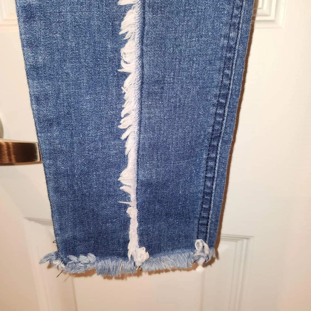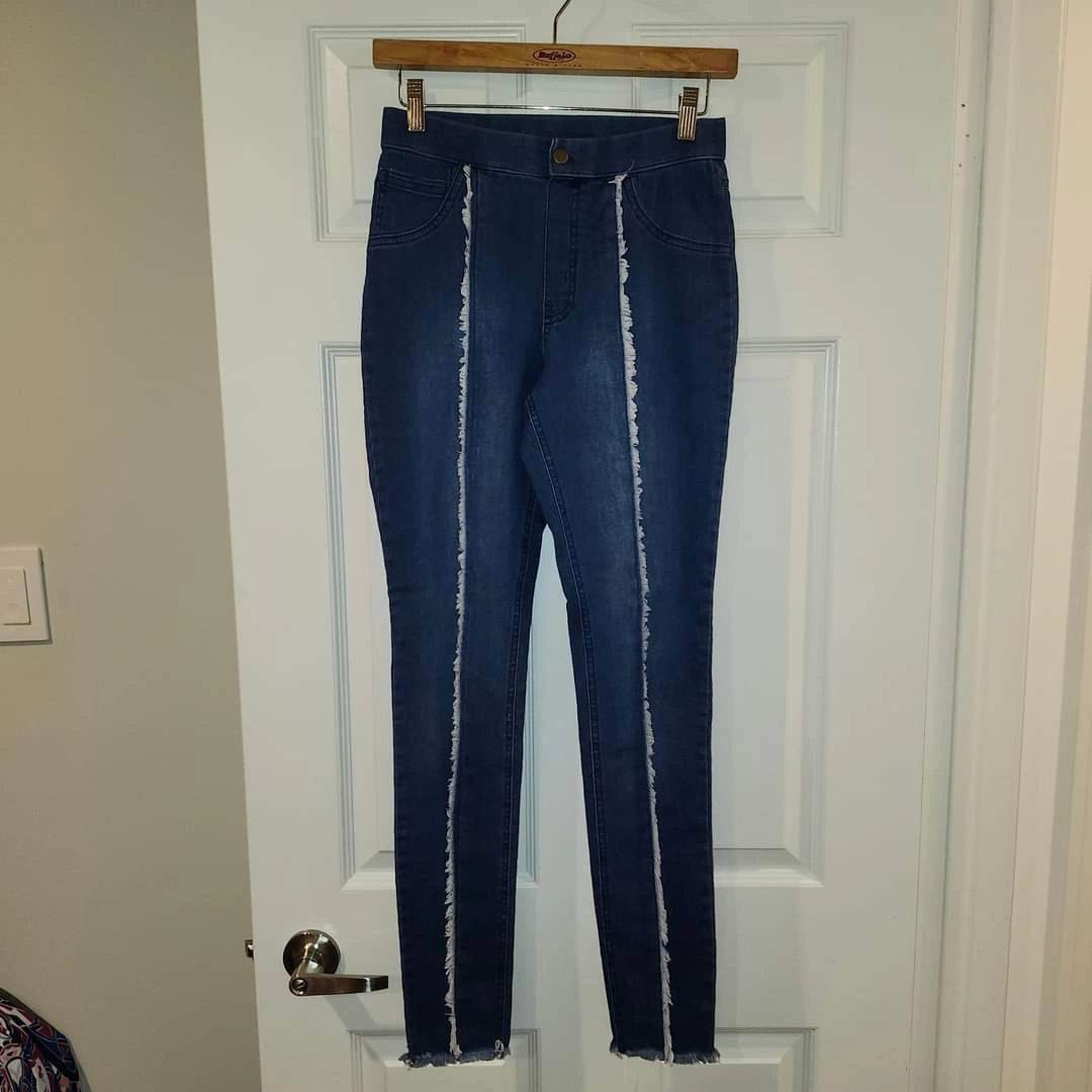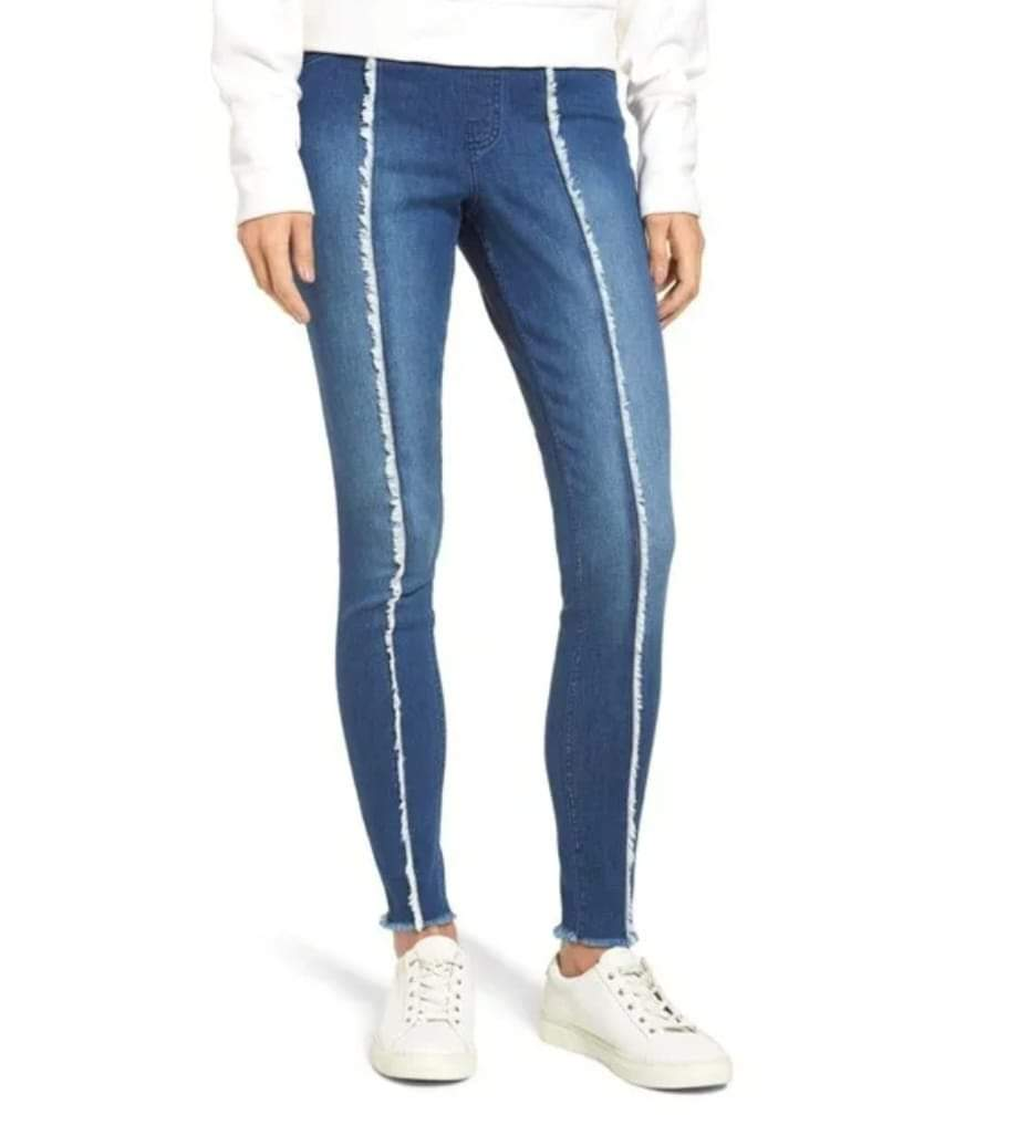 ZEZA B by HUE. High Waist Frayed DENIM LEGGINGs with Raw Edge Hem & Detailing down the Front Legs.