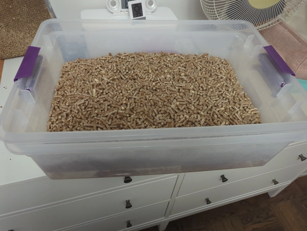 home made litter box from two Sterlite storage boxes. I drilled holes in the bottom to help sift the wood pellets through once they turn into dust. I can throw away the cat litter if you'd like.