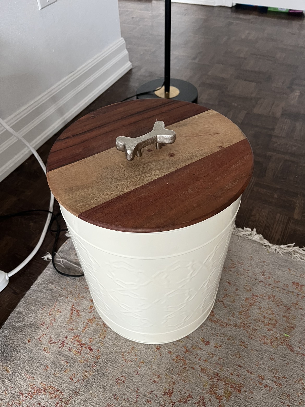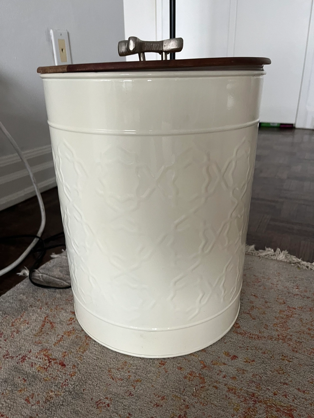 Completely airtight great quality, using it to store toys, the base is metal with a pattern and the lid is made of wood.