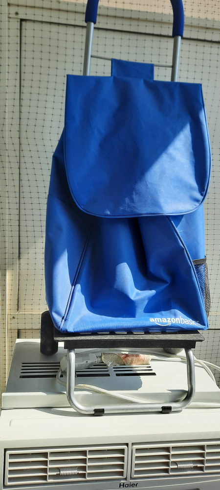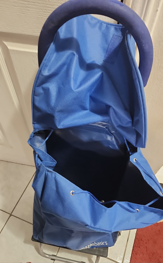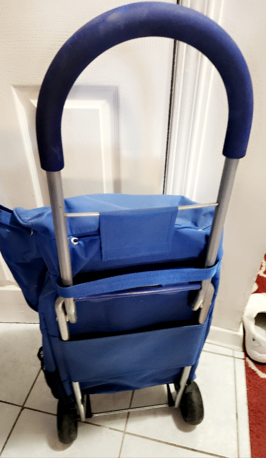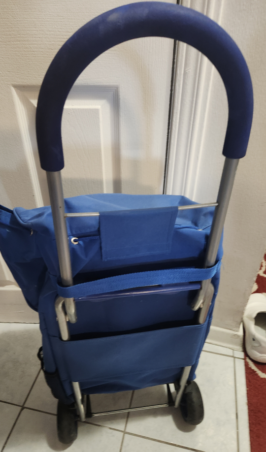 I am selling this blue shopping cart to someone in need of help with grocery shopping. It has been used a few times and is still in perfect condition. All wheels are sturdy and in tack.