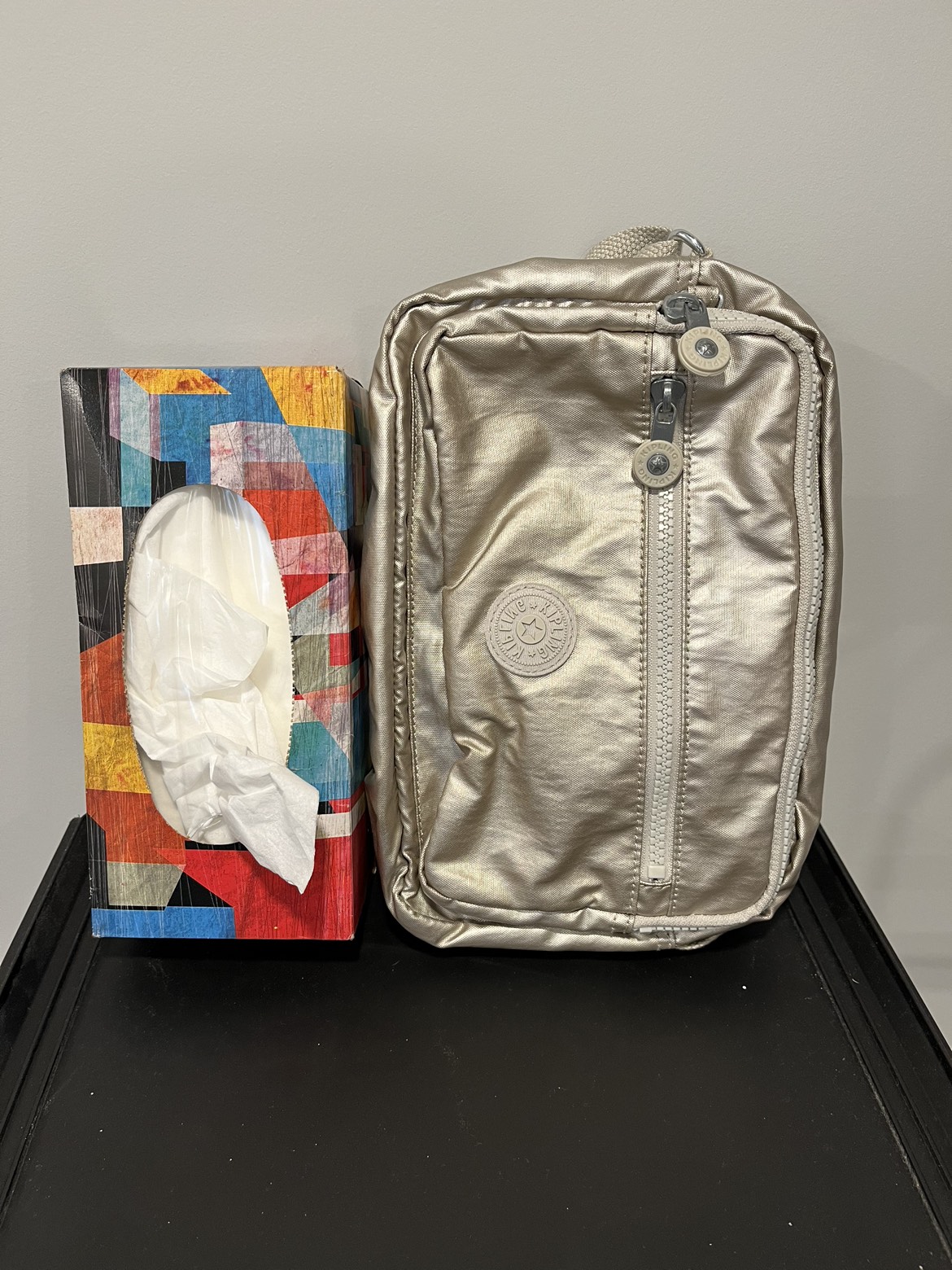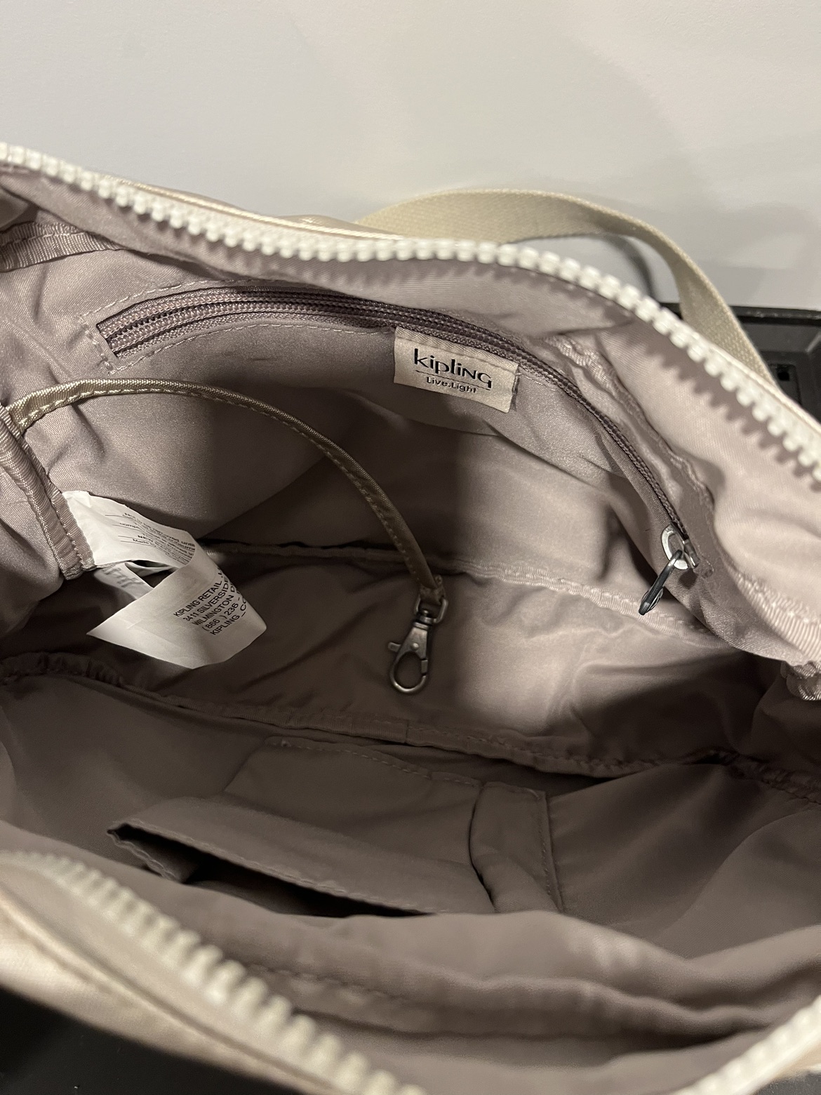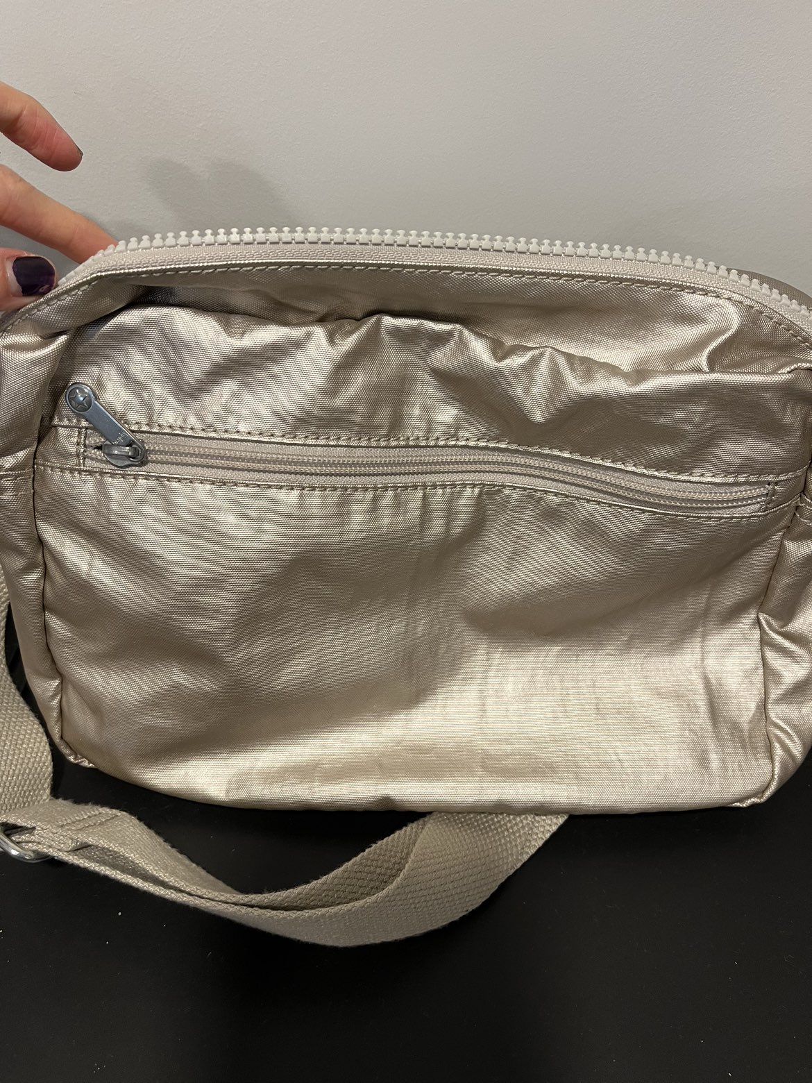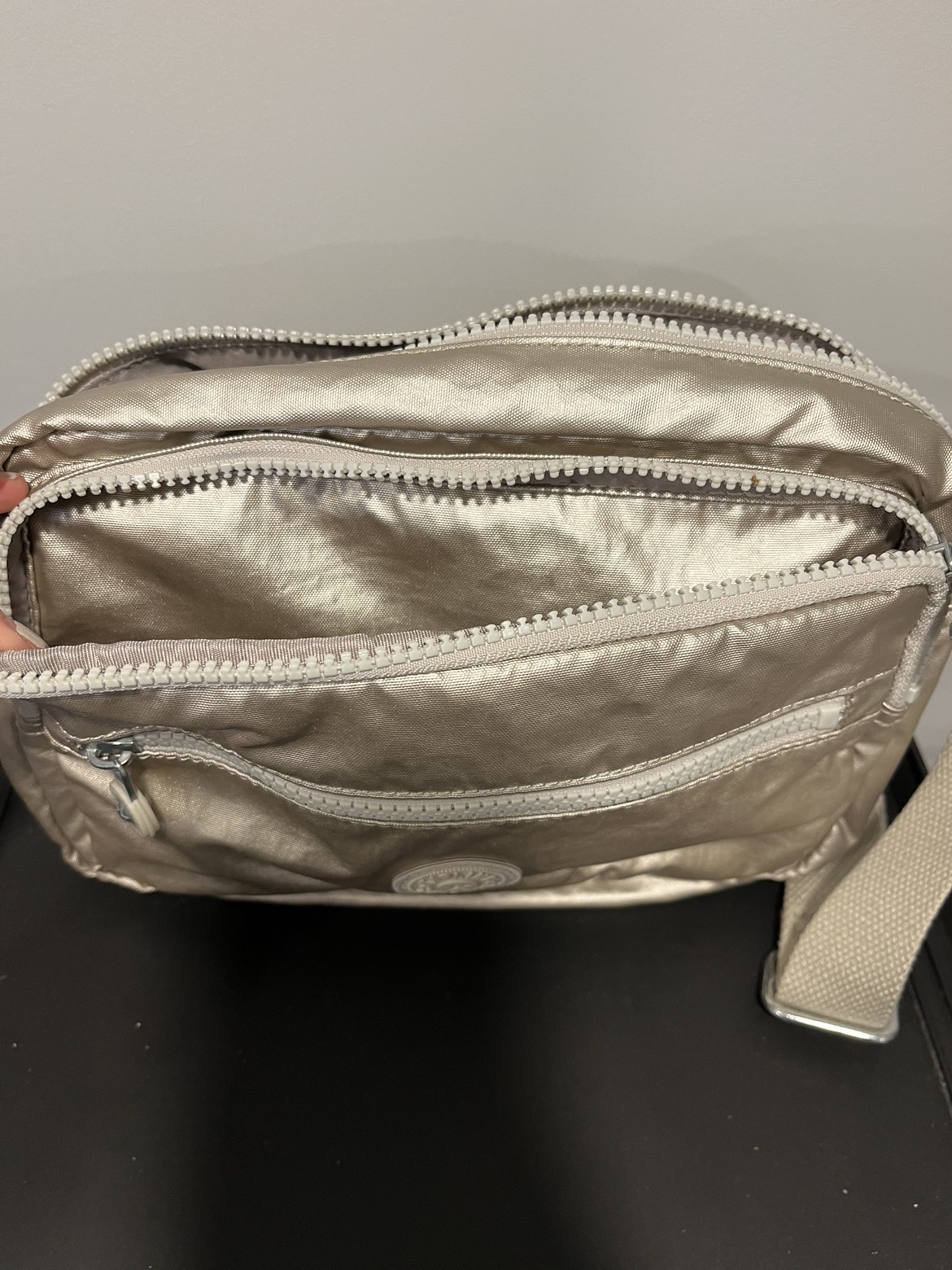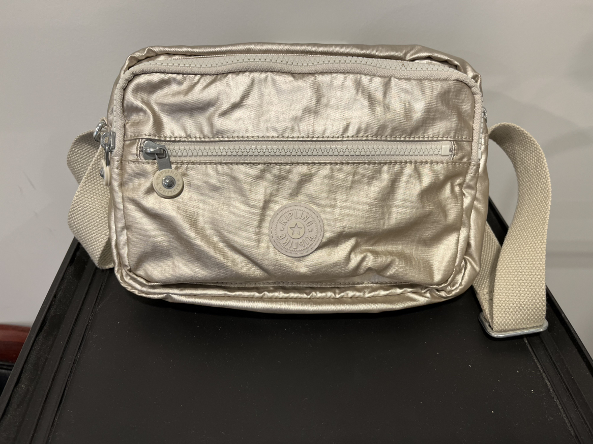 Smoke free pet free home Pick up only Yonge & Steeles Item brought to driveway Authentic Gold Kipling Deena crossbody purse Big one fits everything. Multiple zipper pockets, adjustable strap. Great for travelling, fits passport Knick knacks and small bottle of water Security strap inside and phone pocket on outside back.