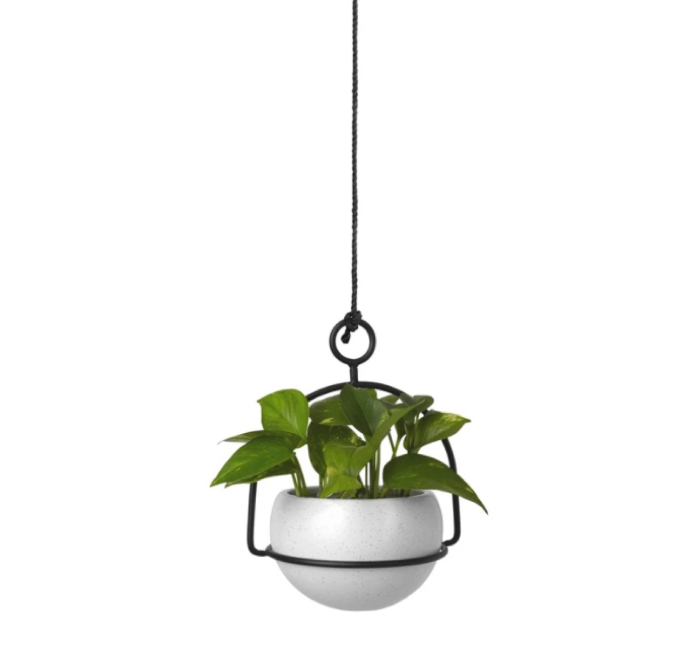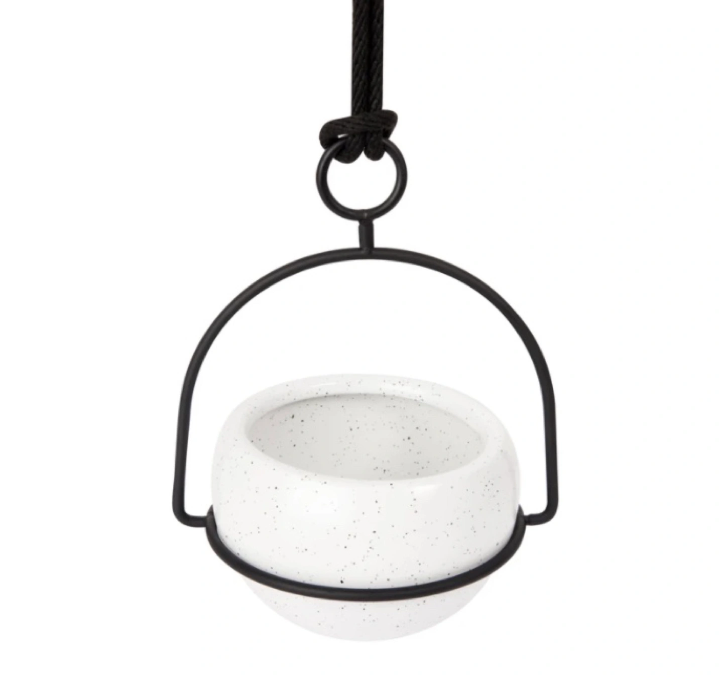 Accent your living space by bringing the outdoors in with the Nesta Planter. Its sculptural and minimal design is perfect for any modern living space. The white speckled ceramic pot can be rested inside the sculptural base at different angles to help you better show off the plants inside. If you prefer hanging plants you can easily transform Nesta into a hanging planter, it comes with an attachment that converts it from freestanding to hanging, the rope is not included. Perfect for small space living Nesta measures 6 ¾ x 5 ½ x 7 ¾ inches (17 x 14 x 20 cm) and is suitable for plants with a diameter between 2-4 inches (5 - 10 cm).