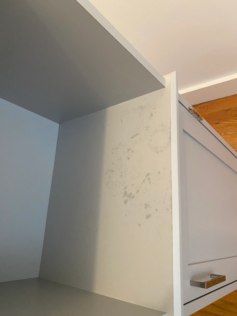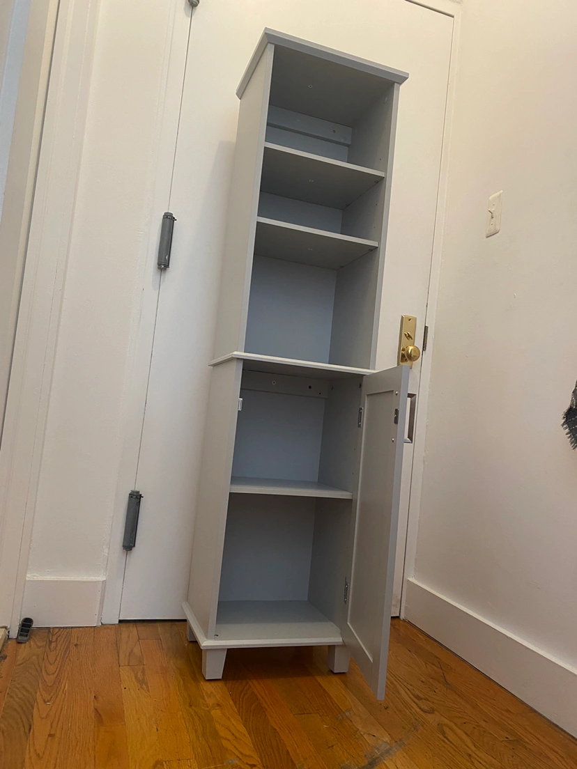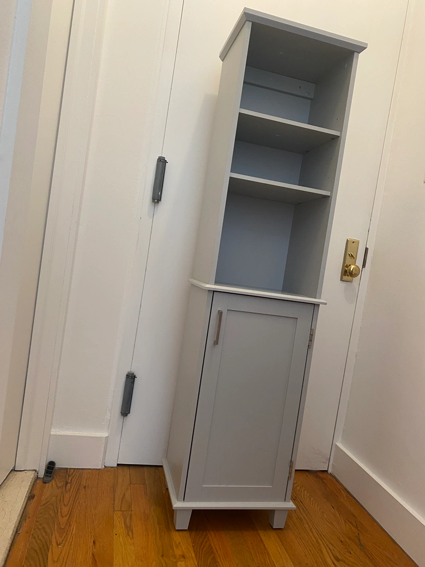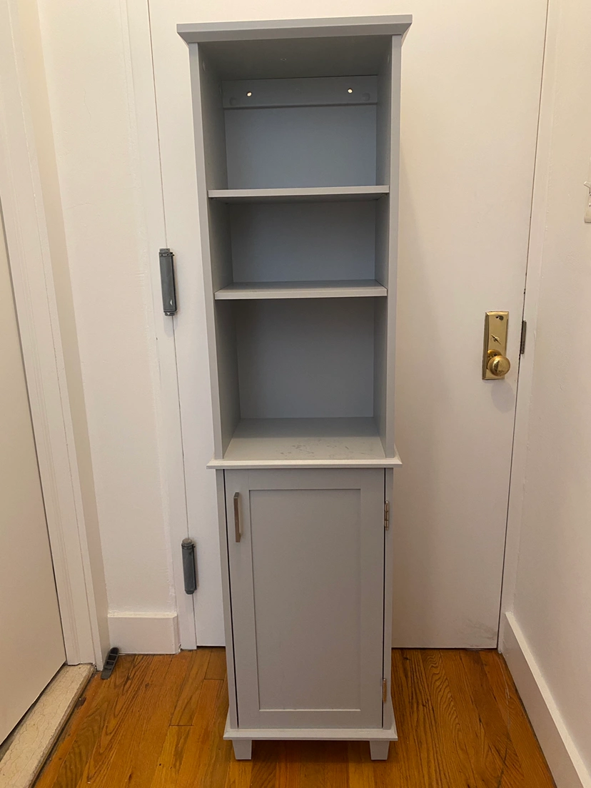 Gray in colour, used less than 6 months (we upgraded to a bigger one. Some light staining from body products on lowest shelf, otherwise great condition. Original price $140, Home Depot Glacier Bay.