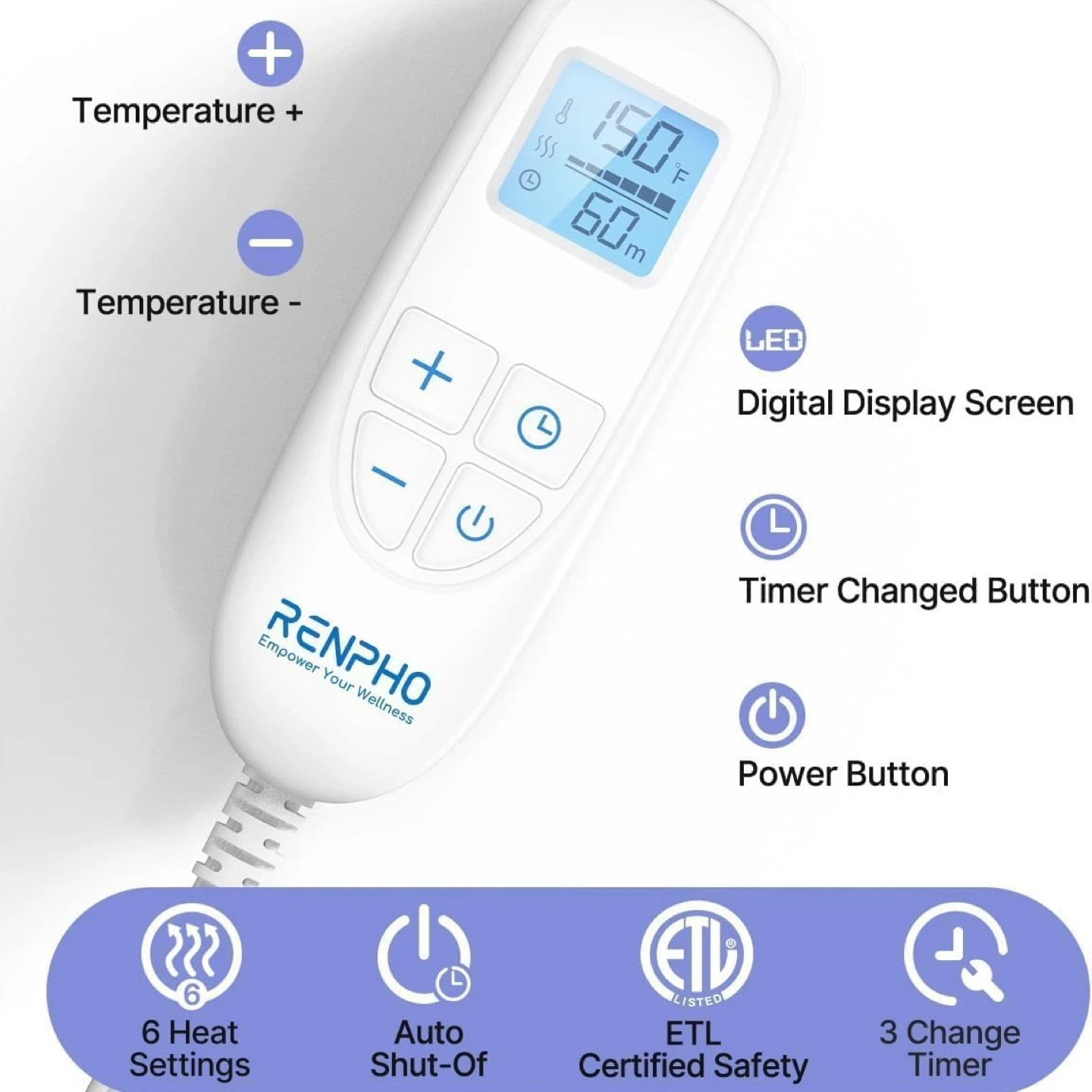 Offering 6 temperature settings (100-150℉), and 3 auto shut-off timers (30, 60, 90 minutes).