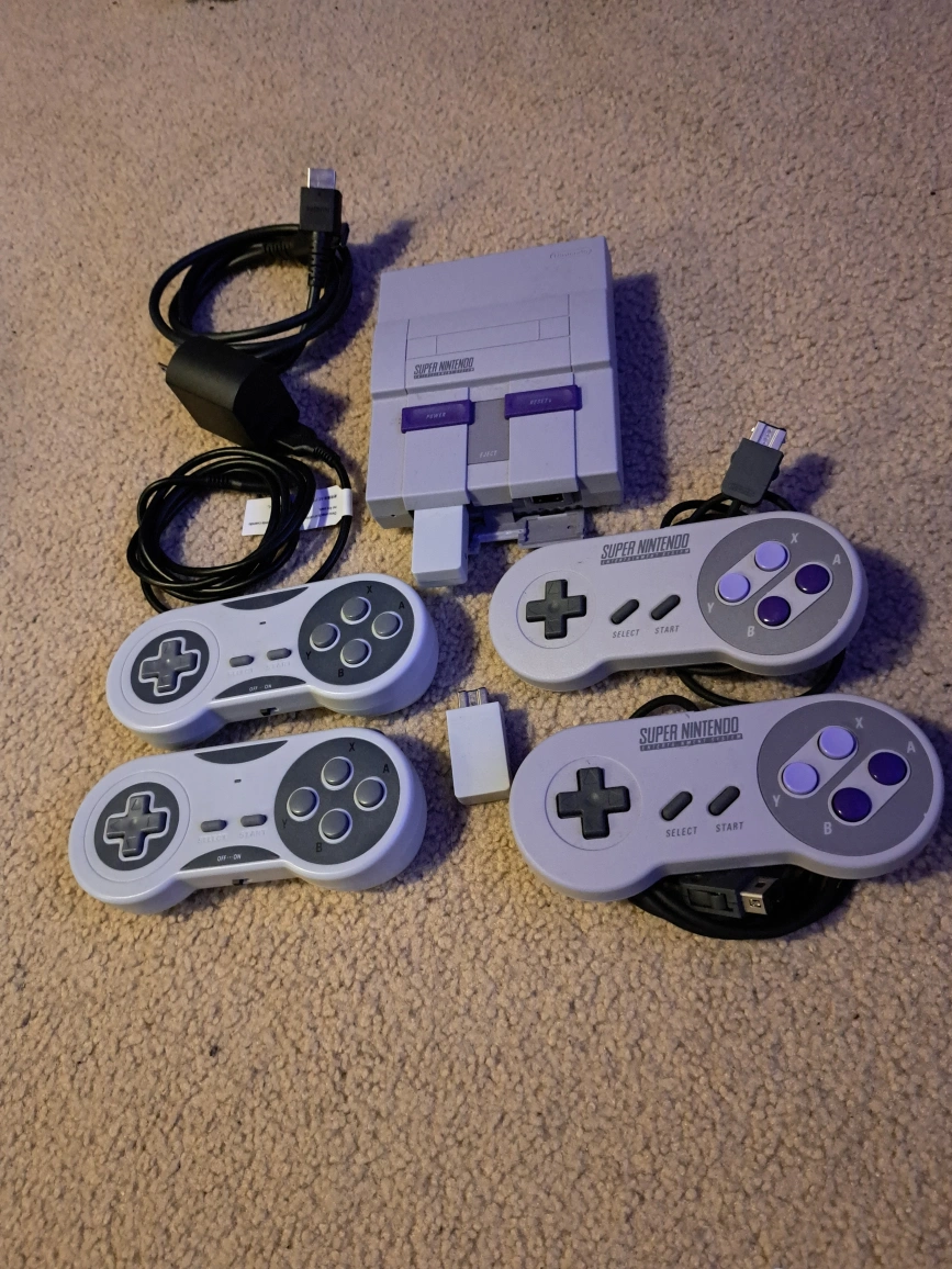 mini SNES with original 21 loaded games. I also added over 100 additional games. Includes 2 original controllers and 2 after market wireless controllers. Batteries included.