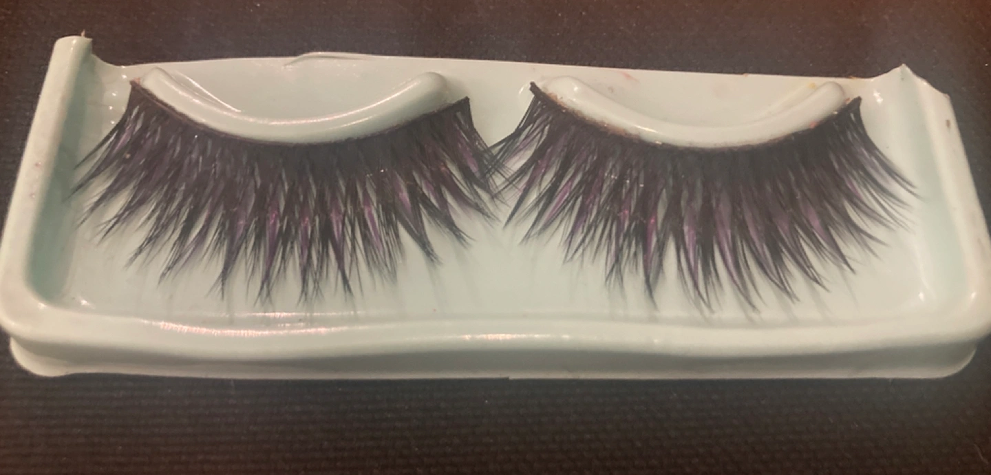 Unworn set of false eyelashes (glue on). They are very long and very dramatic! Intermixed with the glossy black lashes are blueish-purple ones for a unique look! Note: these were taken under a warm light, so the coloured strands are not as purple as they look in the photo!