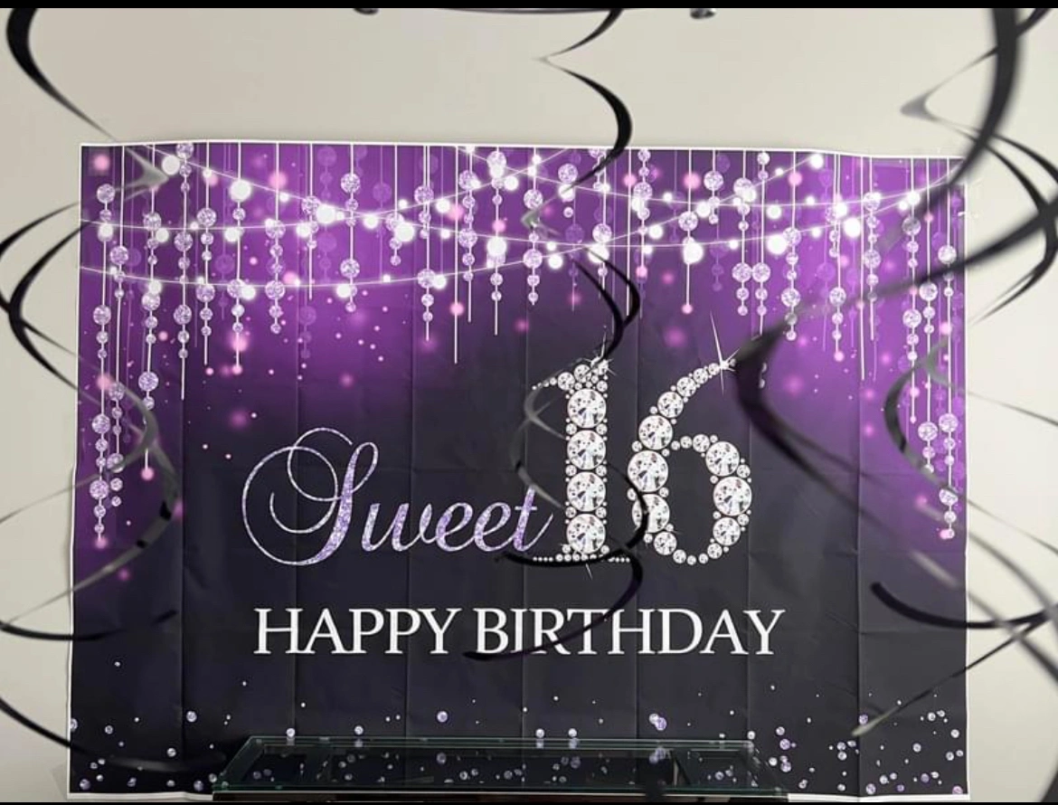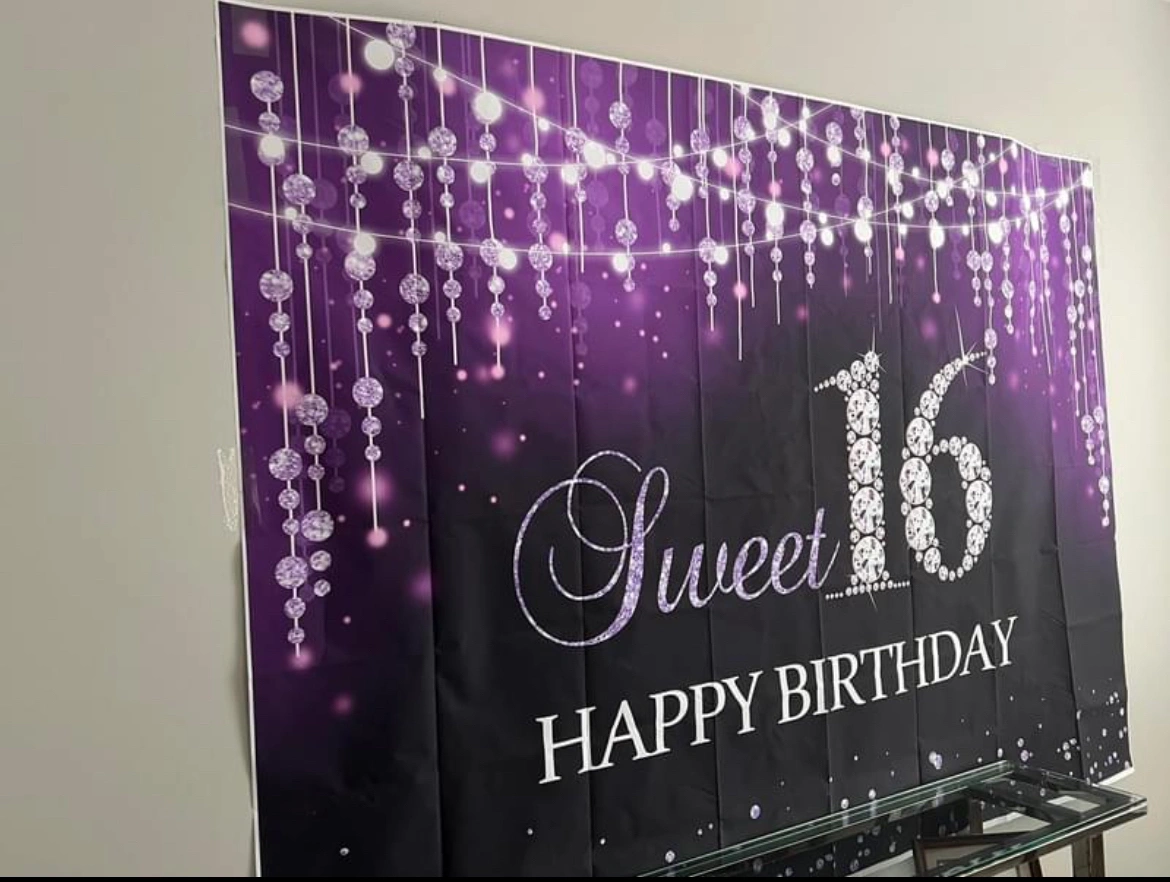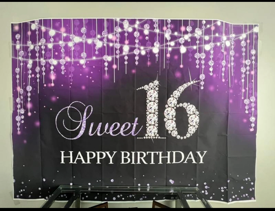 Sweet sixteen backdrop size 7×5ft (width×height), very high quality print.. not cheap pvc, durable, High-resolution digital print, non-toxic, touched safety.