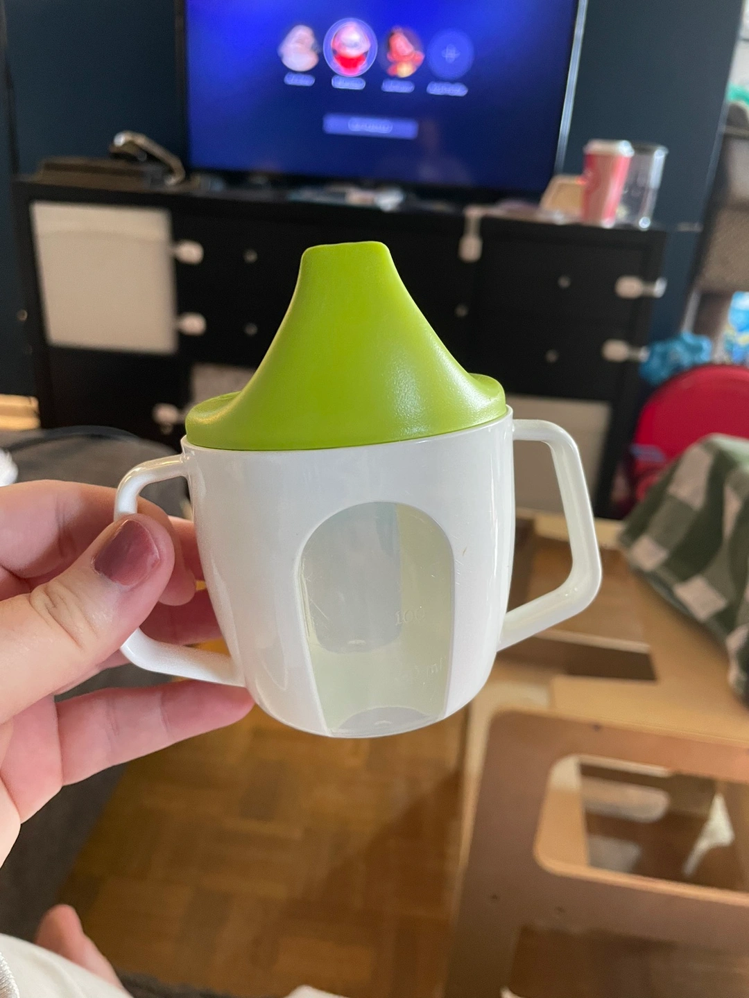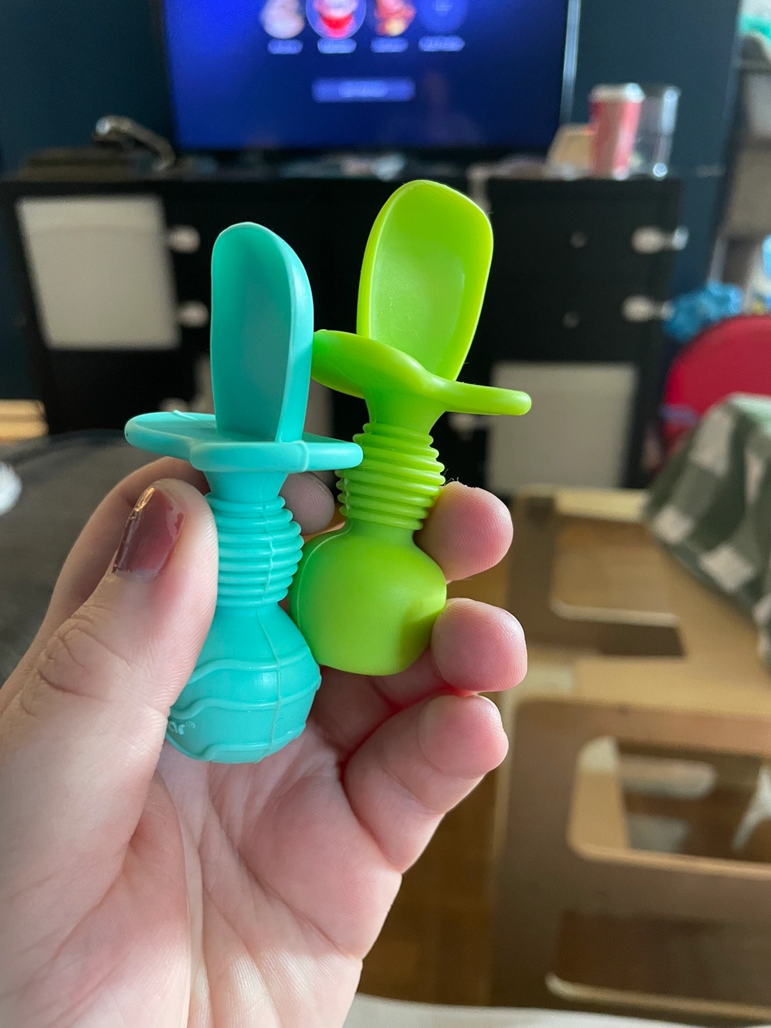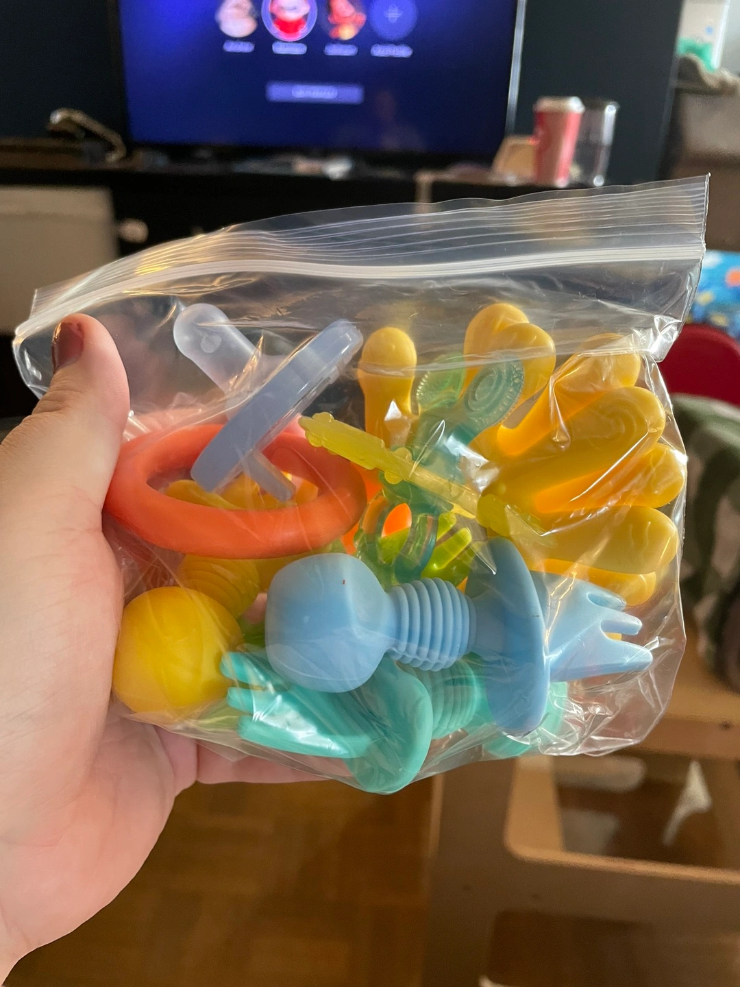 A bunch of teethers, silicone spoons and forks, and a sippy cup from ikea