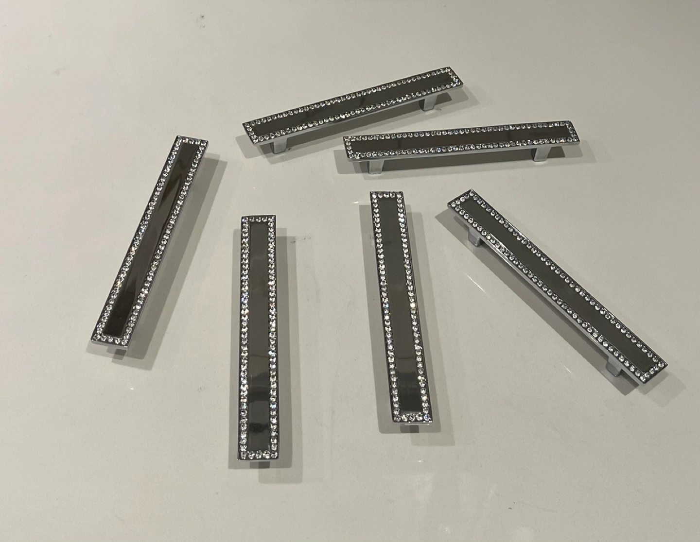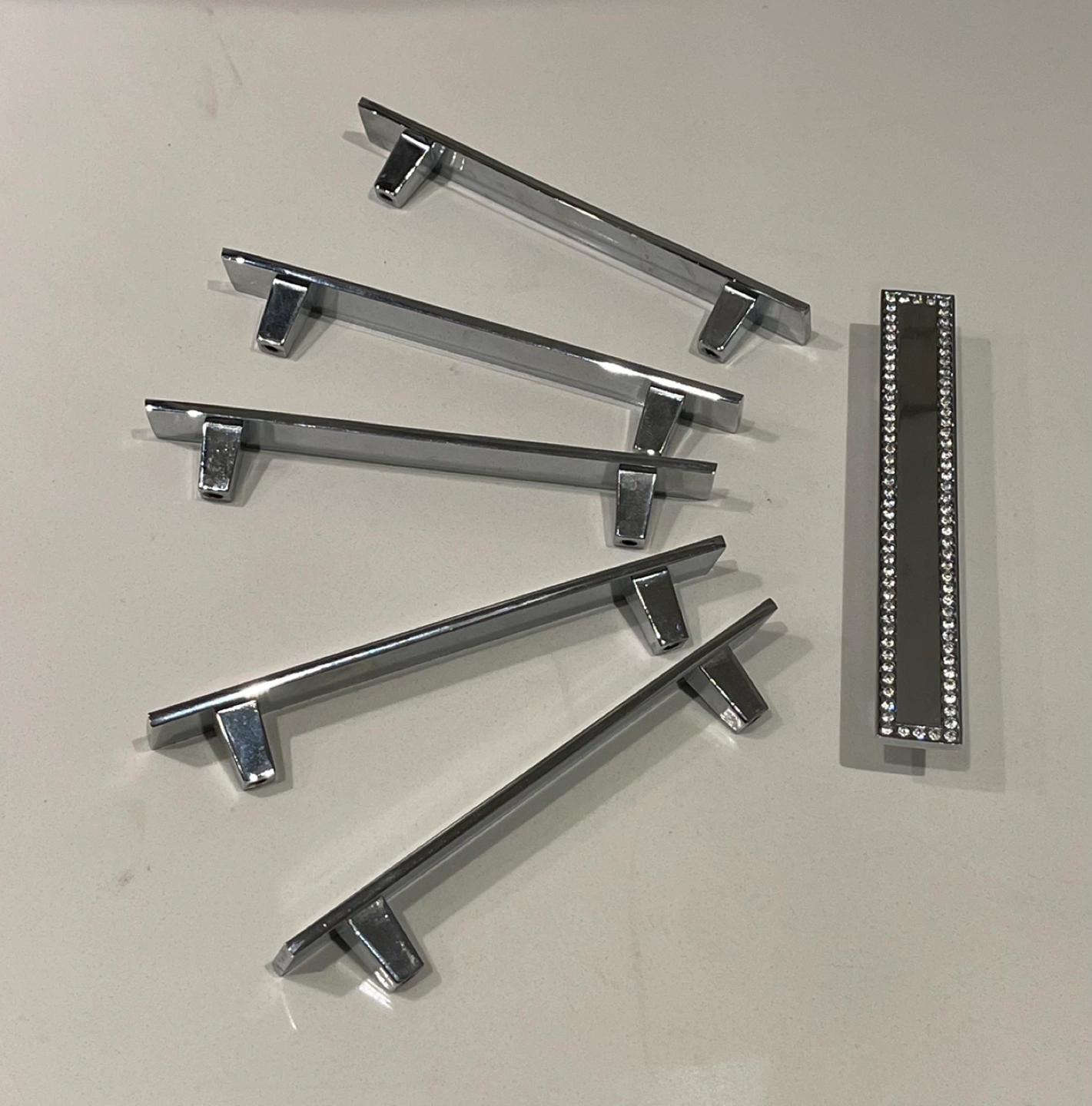 At less than half the original cost charged at Home Depot or Amazon you can upgrade your furniture with these beautiful Crystal and chrome furniture pulls . Purchased for just over $11 each plus tax . These are in new condition none of the crystals are missing, no scratches , these sparkle in the light. Just under 5 1/4 inch long . Centre to centre between each screw hole is 3.78 inches.
