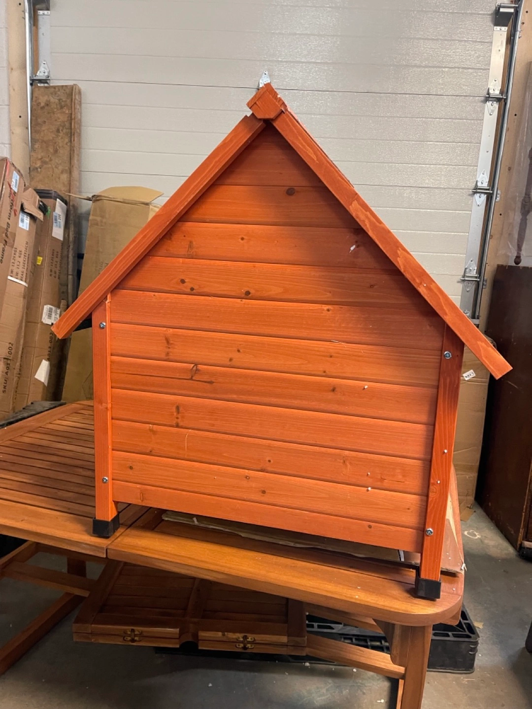 Retails for $360 online. Large measures 34.3”H x 39.8”W x 33”D. This Log Cabin Dog House is designed to let your dogs snuggle in after a good day of playing in the sun. The dog house is portable and can be positioned in at corner of your garden or backyard. The dog house has solid pine construction that defines the strength and sustainability. Weatherproof model with draft resistant tongue and groove design.
