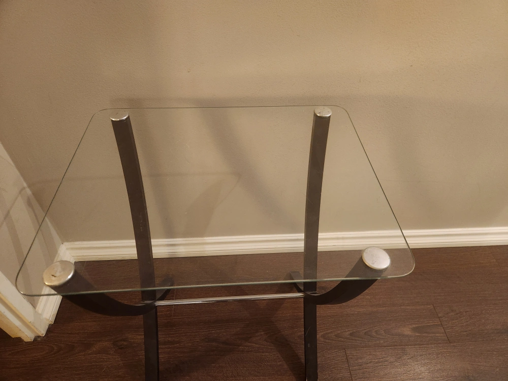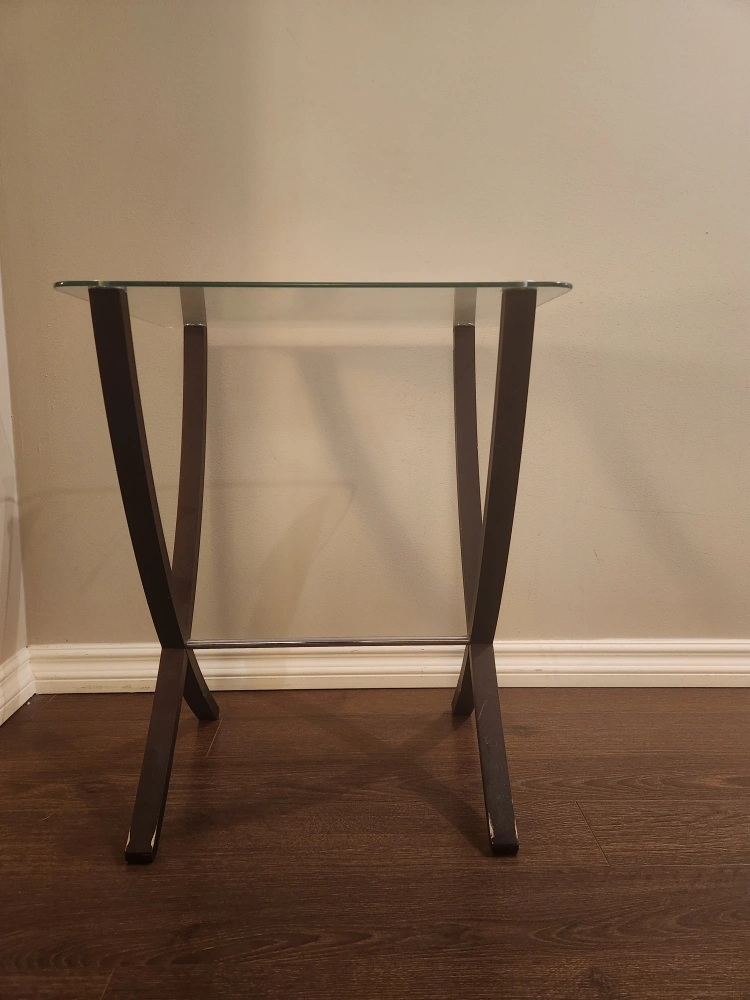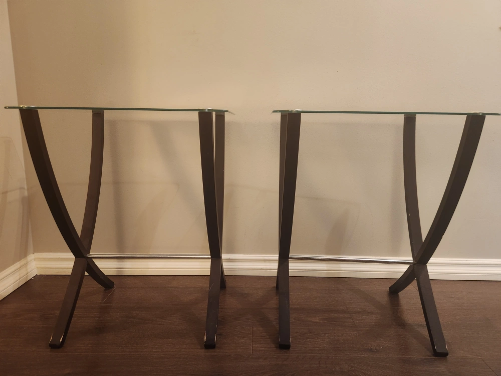 Three matching glass tables. They are in excellent used condition. We got a dog who gets crazy zoomies, and we don't want these to break during one of his zoomy episodes.