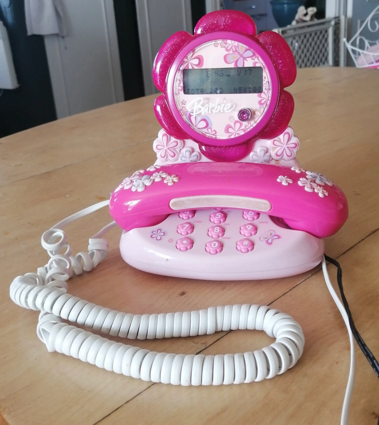 Barbie Blossom Phone Caller ID Corded Telephone.Colorful telephone, featuring a bright pink hand set with comfortable rubber grips, bubble gum pink base and sparkled number display. Features include a gemstone fun button which activates a Barbie melody ring tone and a flashing light in the Barbie flower frame for those important inc