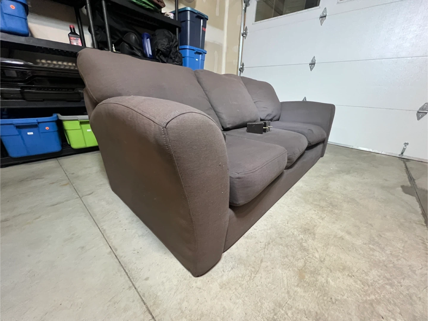 This is a comfortable brown three-seater sofa. It's upholstered in a soft fabric and has plush cushions. It would make a great addition to any living room!