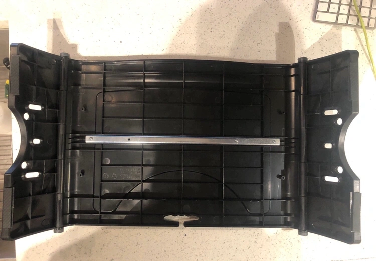 Metal frame covered in plastic, can rise TVs, printers, kitchen robots and heavier stuff up to 25kgs.