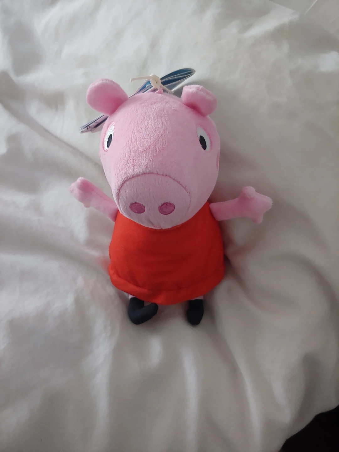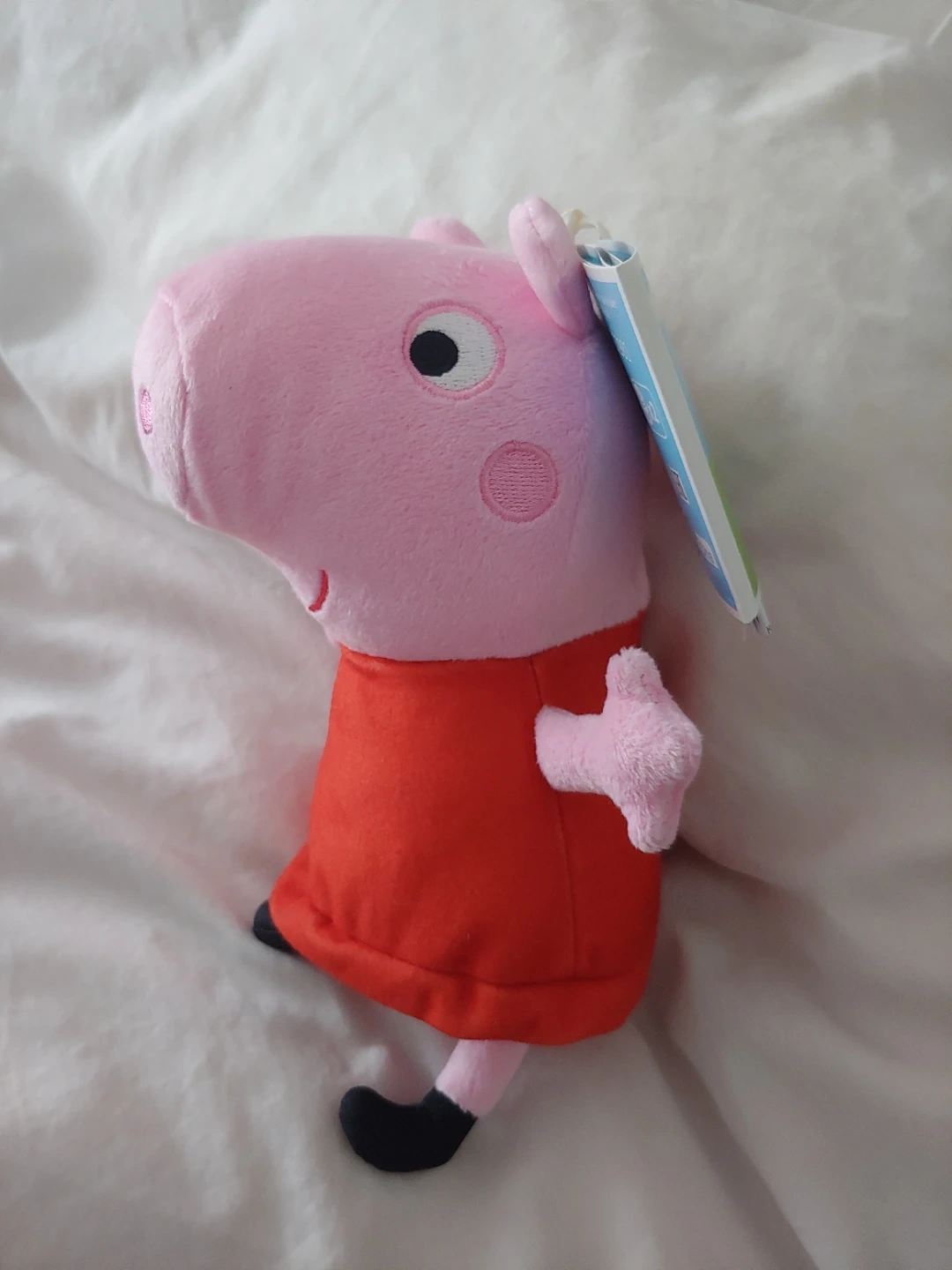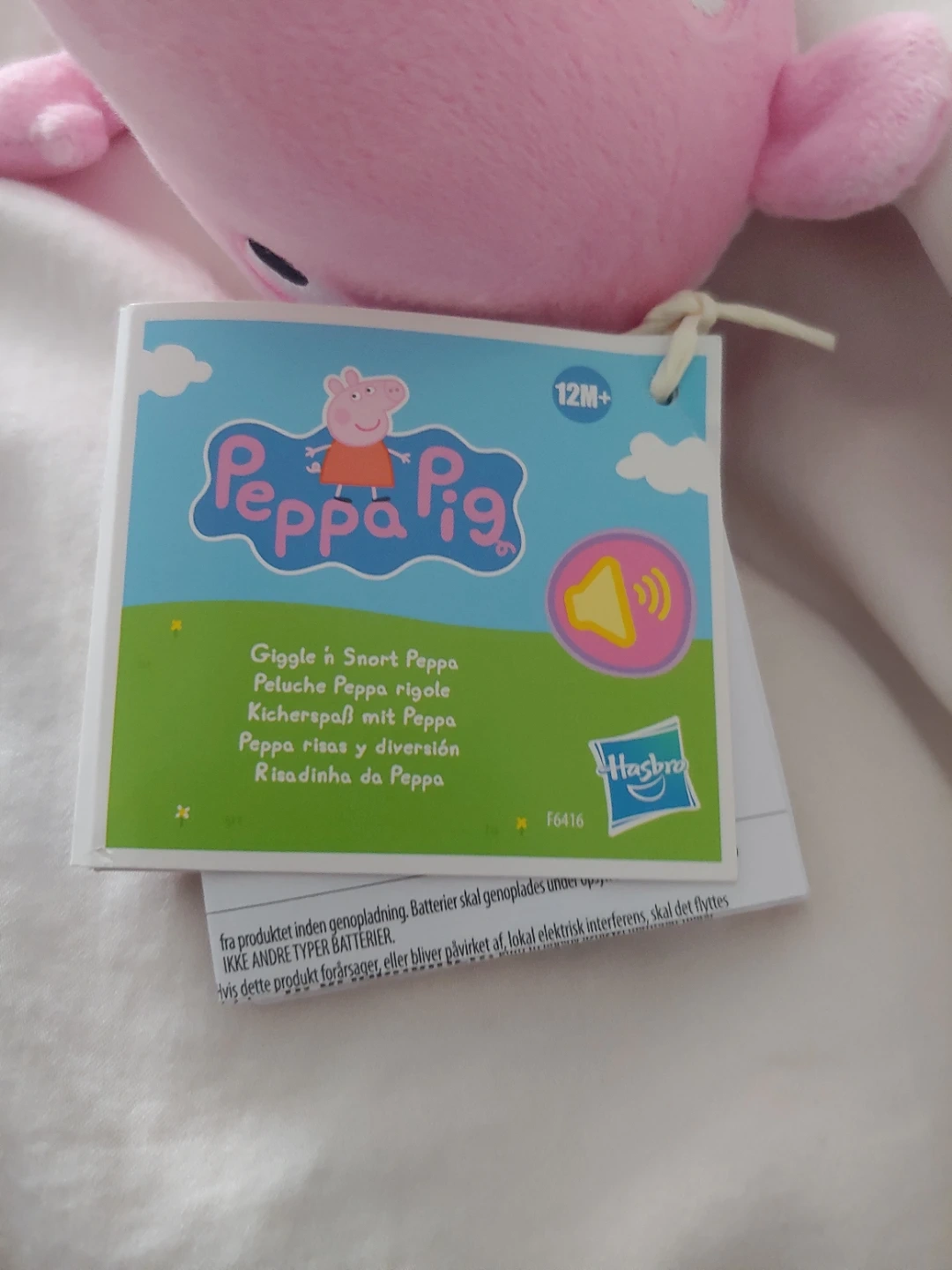 This is a Peppa Pig plush toy. It's designed to giggle and snort when squeezed. Made of soft plush material, it's perfect for fans of the show. Recommended for ages 12 months and up. New with tags.