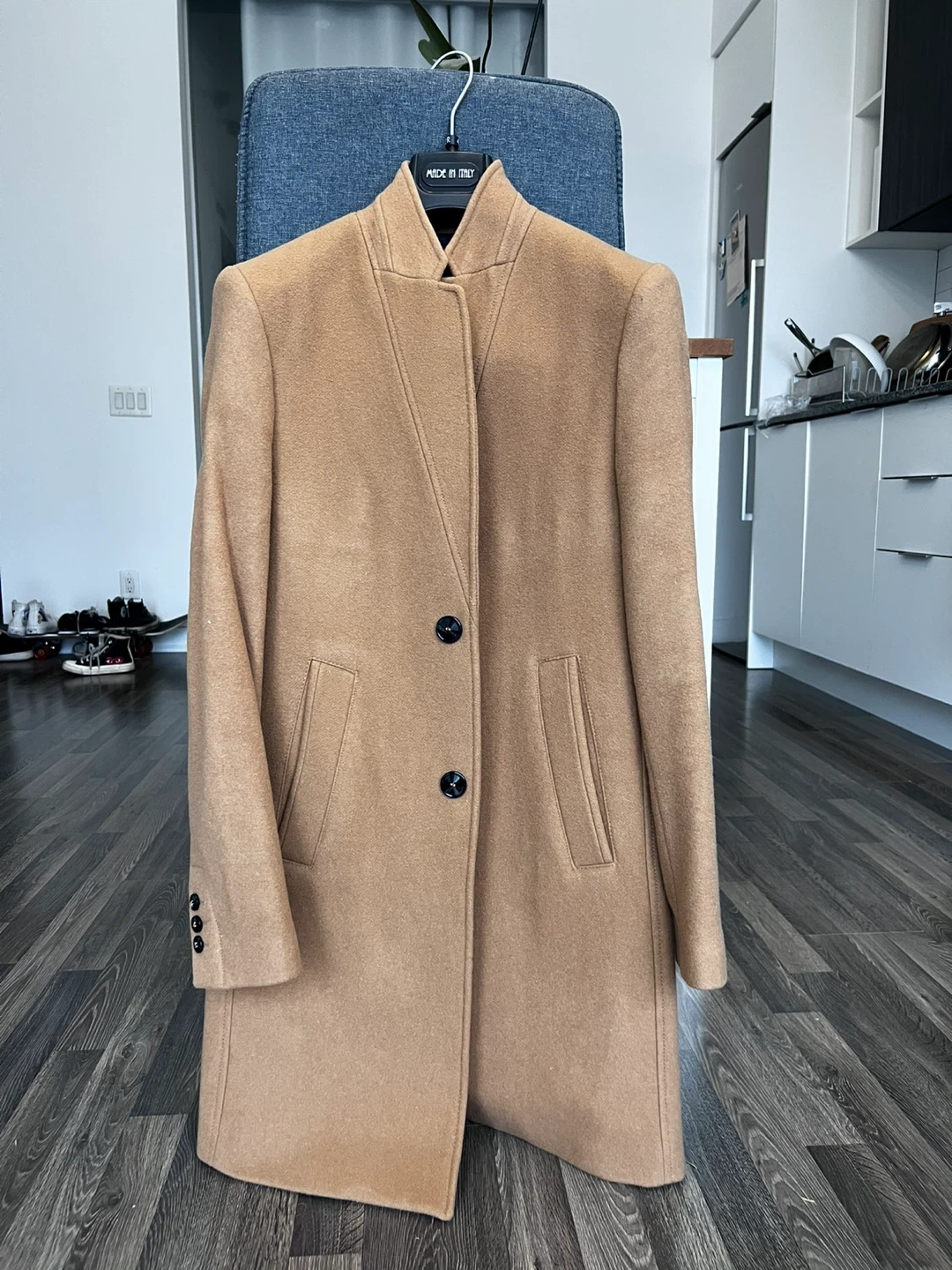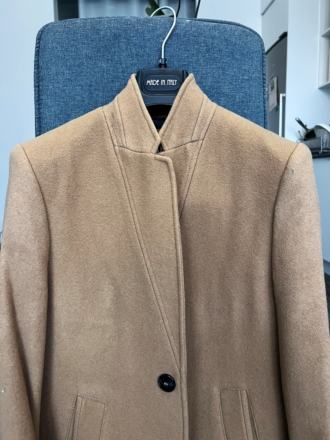Stylish camel-coloured wool blend coat from Zara. It features a modern collar and button closure. Made in Morocco.