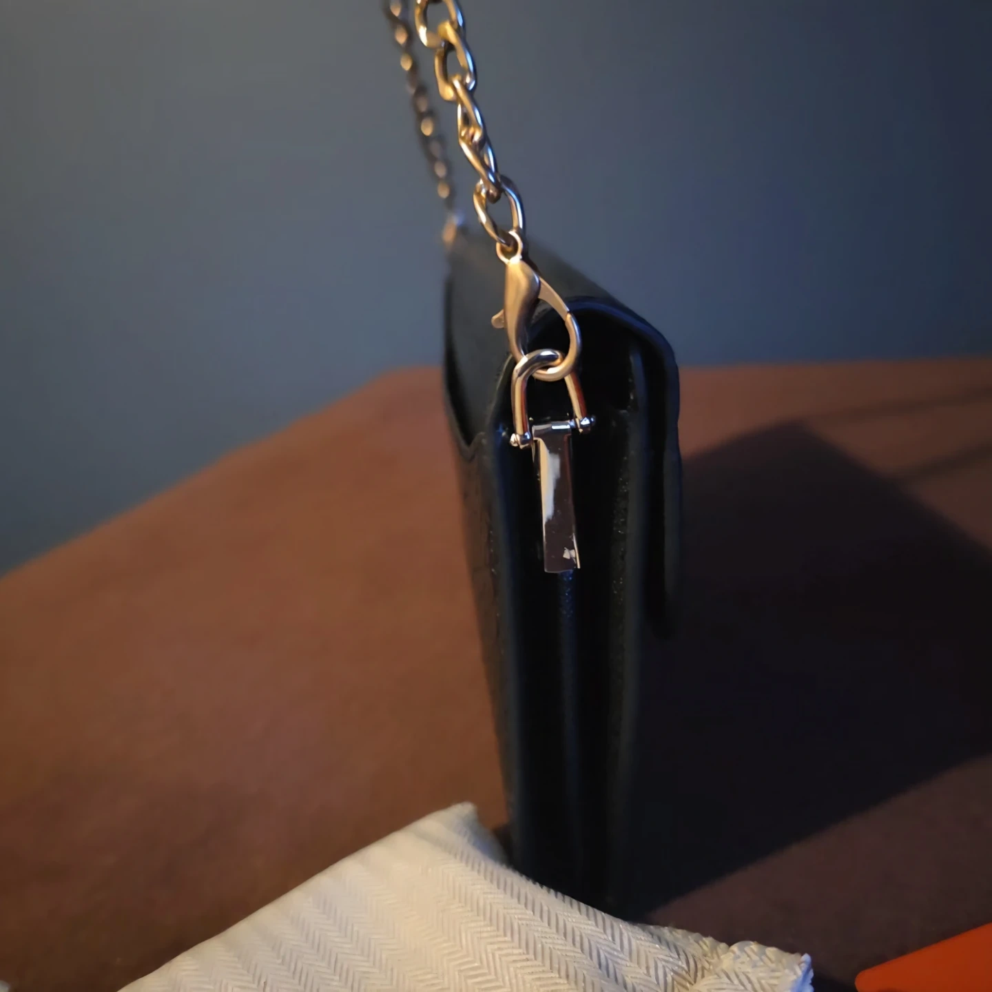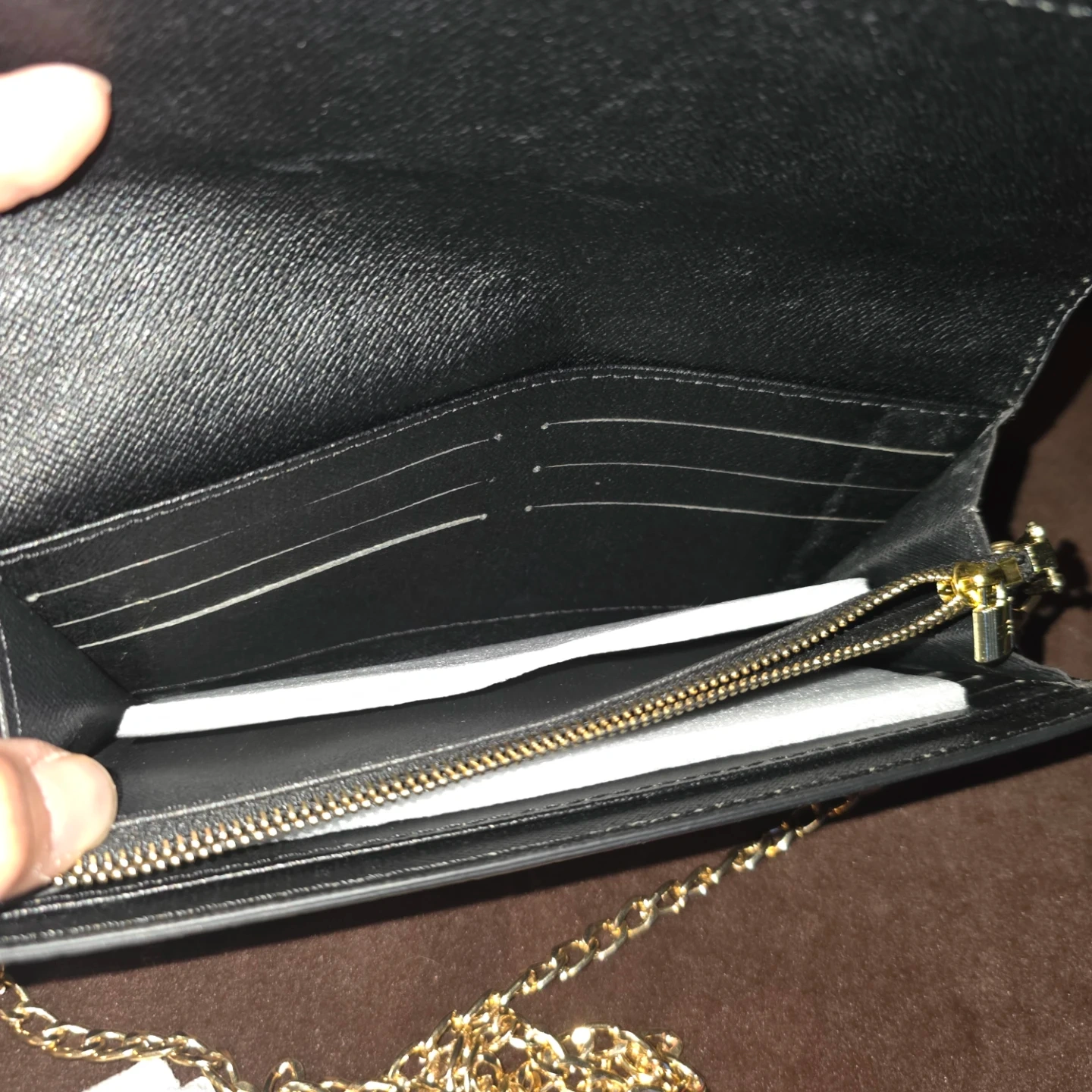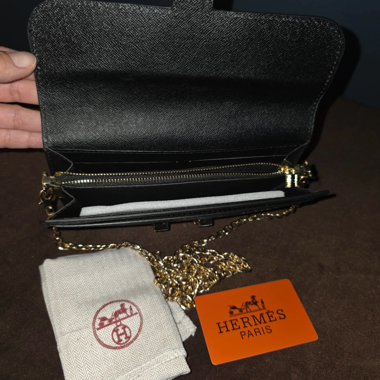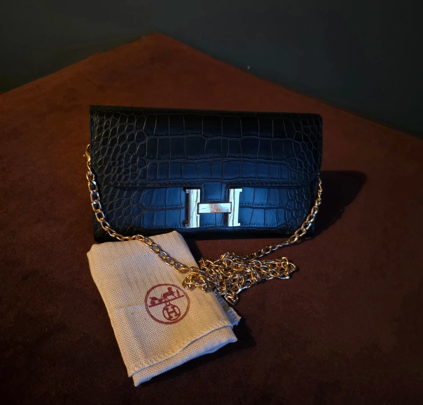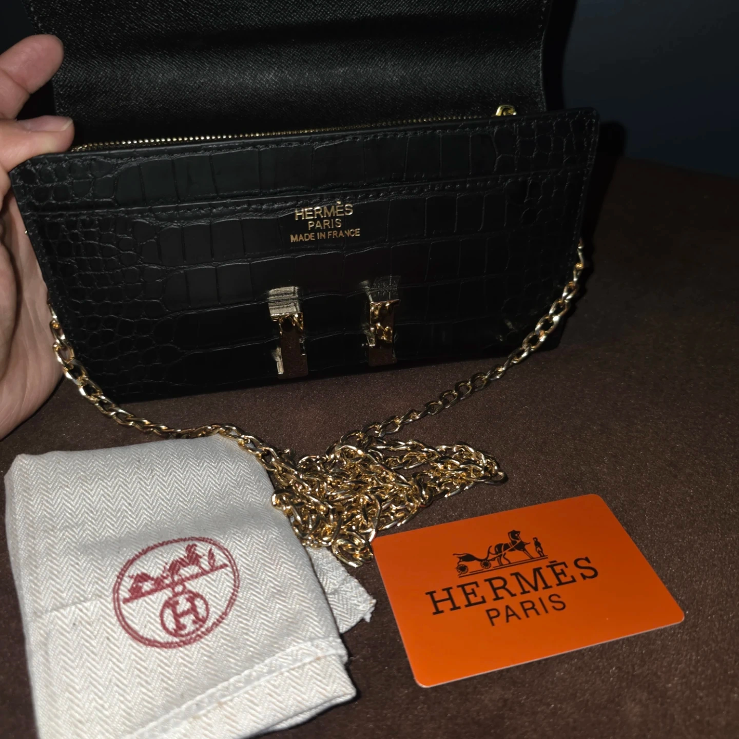 Inspires Hermès Paris chain wallet in black with a croc embossed exterior. Features a gold-tone hardware closure and a detachable gold chain strap. Made in France. Includes dust bag and authenticity card.