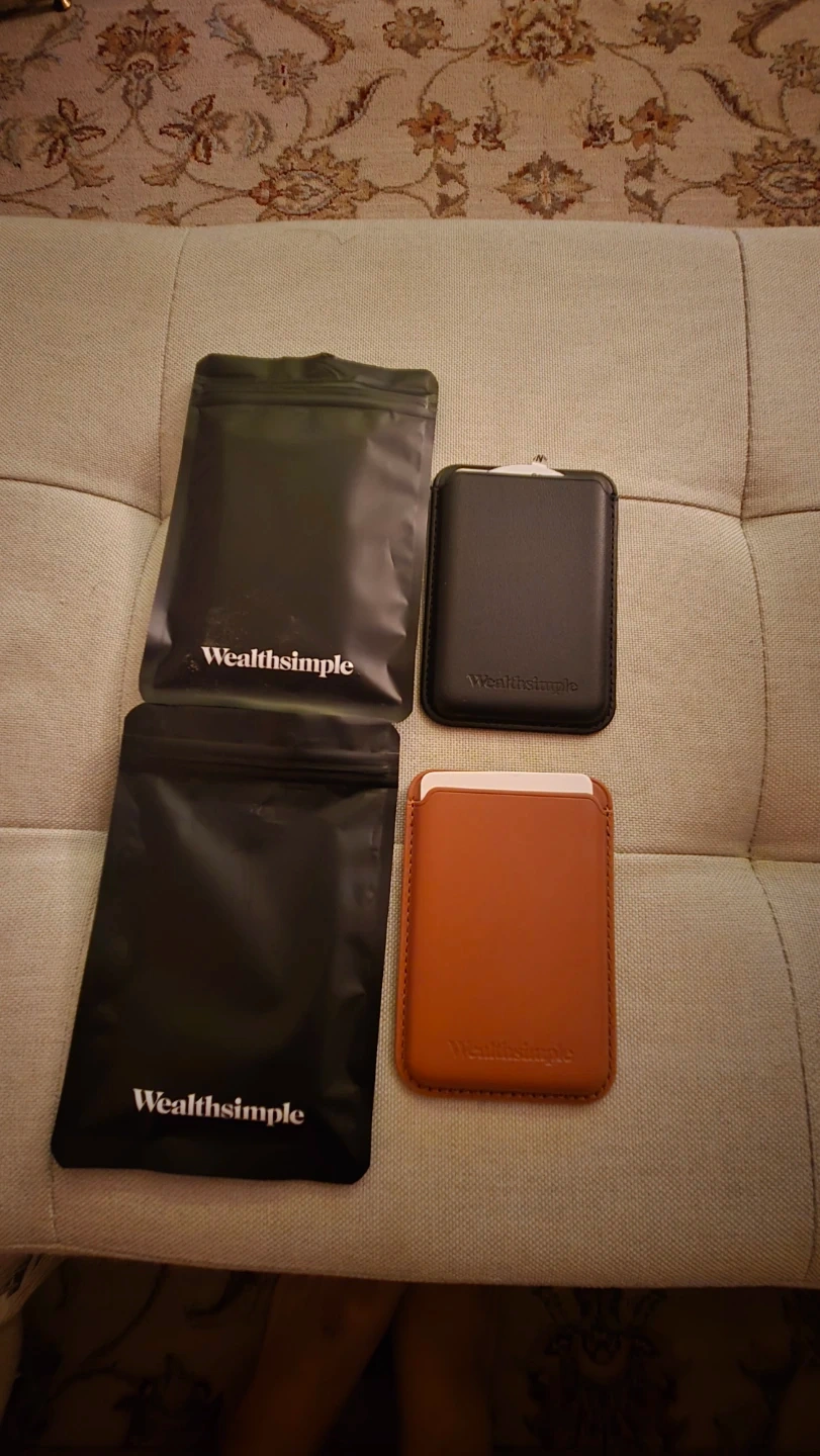 Two Wealthsimple card wallets. One black and one tan. Both made from faux leather. Includes two black Wealthsimple pouches.
