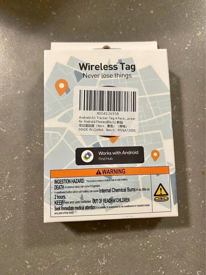 New Tagnnitlr wireless tracker tags. This is a 4-pack in black. Super handy for Android phones, works with Google's Find Hub network. Helps you find your stuff fast, even if devices are offline or far away. Just use the map, sound, or hints to pinpoint your lost items. Great for keys, wallets, bags, whatever you tend to misplace. Requires Bluetooth and internet/cell service to work.